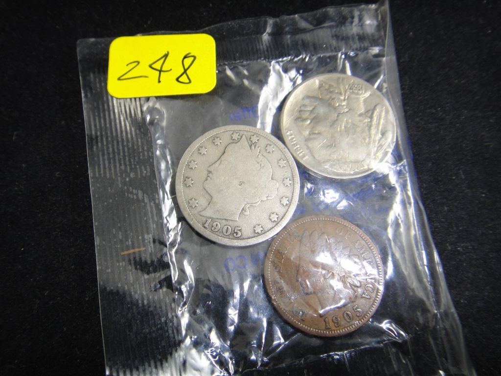 Includes 1905 Indian Head Penny, 1905 V Nickel and 1937 Buffalo Nickel.