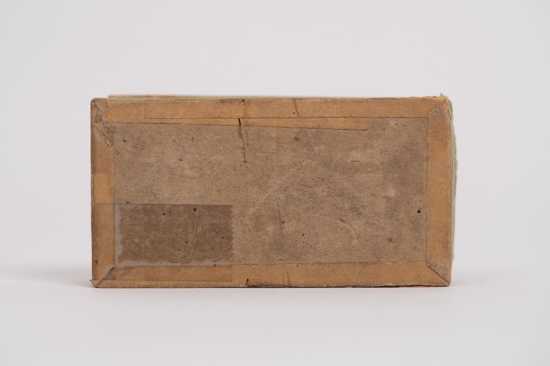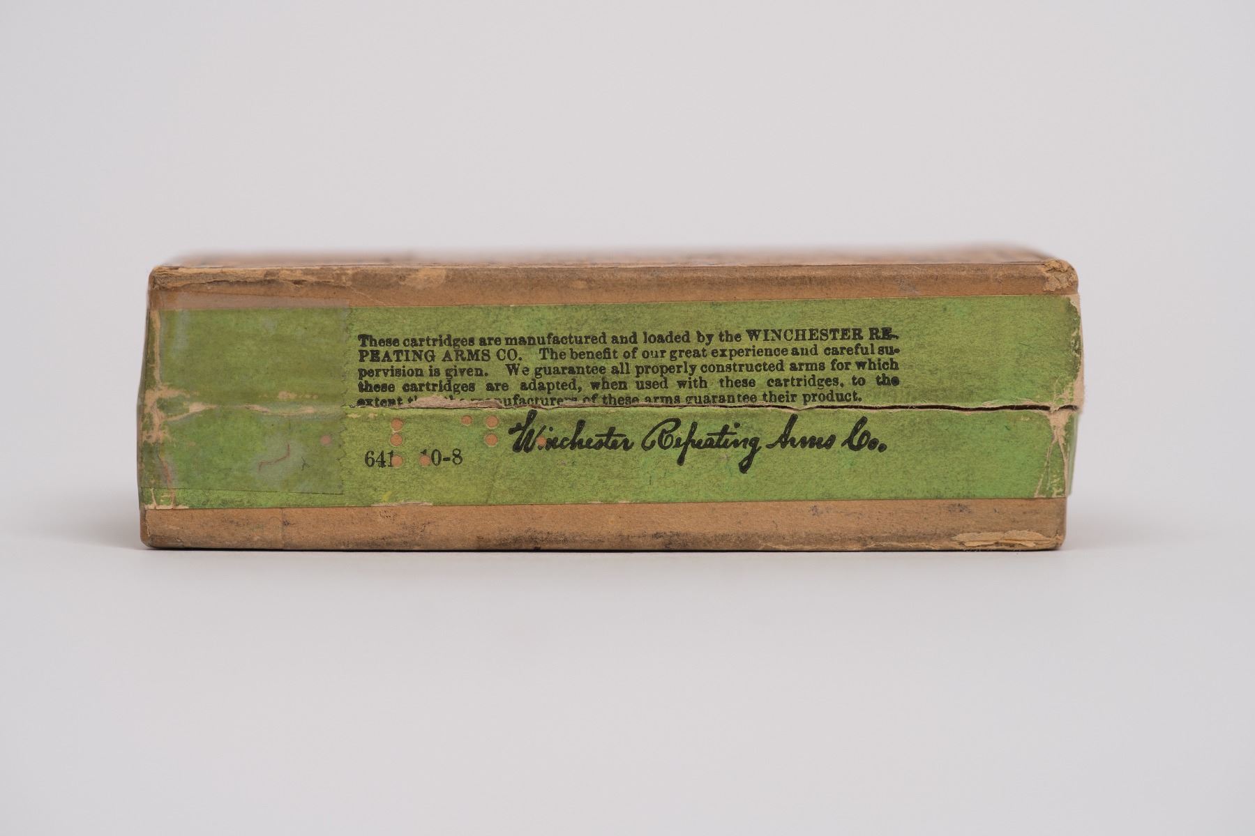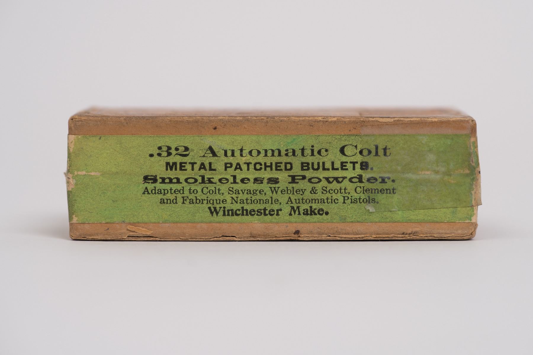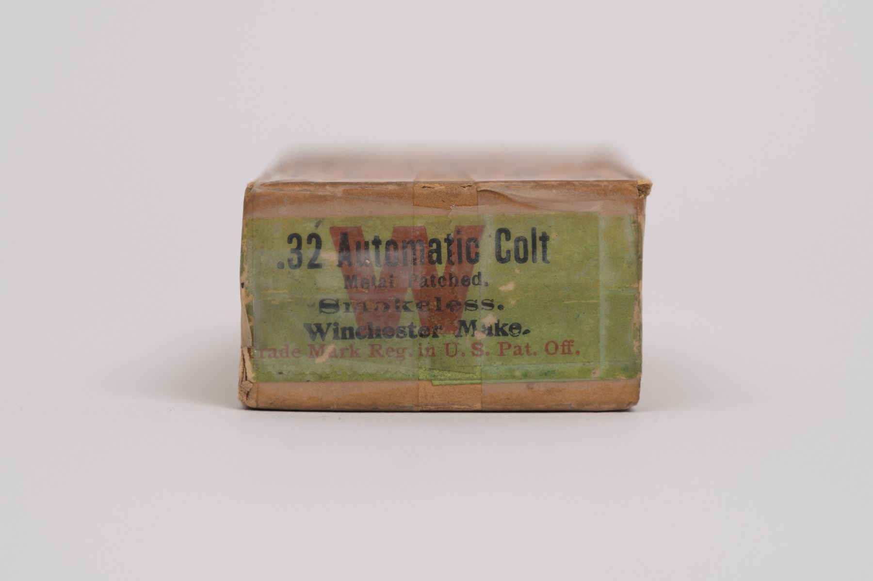 The callout is ".32 Automatic Colt Cartridges" with a picture of the round with W.R.A. Co. headstamp. Additional callout " Adapted to Colt, Savage, Webley & Scott, Clement and Fabrique Nationale, Automatic Pistols". This box has the red "W" end label. The back label is unbroken but there is clear tape on one side, and there is separation along the bottom edge below the back label.