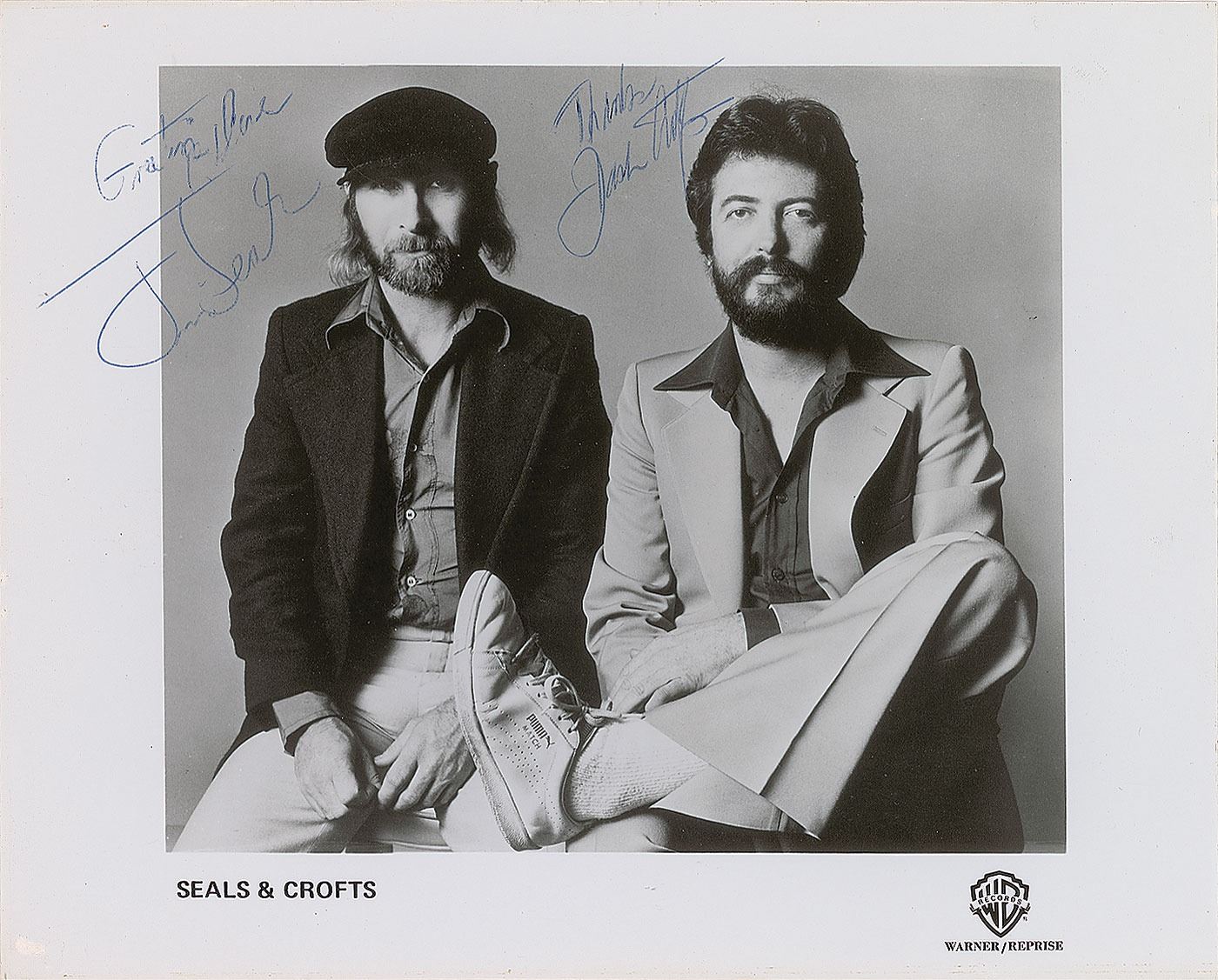 Glossy 10 x 8 Warner/Reprise promo photo of Seals & Crofts, signed and inscribed in blue ballpoint, "Greetings Dave, Jim Seals" and "Thanks, Dash Crofts.” In fine condition.