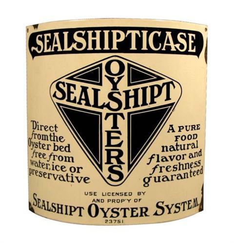 Sealshipt Oysters Porcelain Curved Sign. Minor chips to edges otherwise excellent condition. 15 X 15 1/2 inches.
