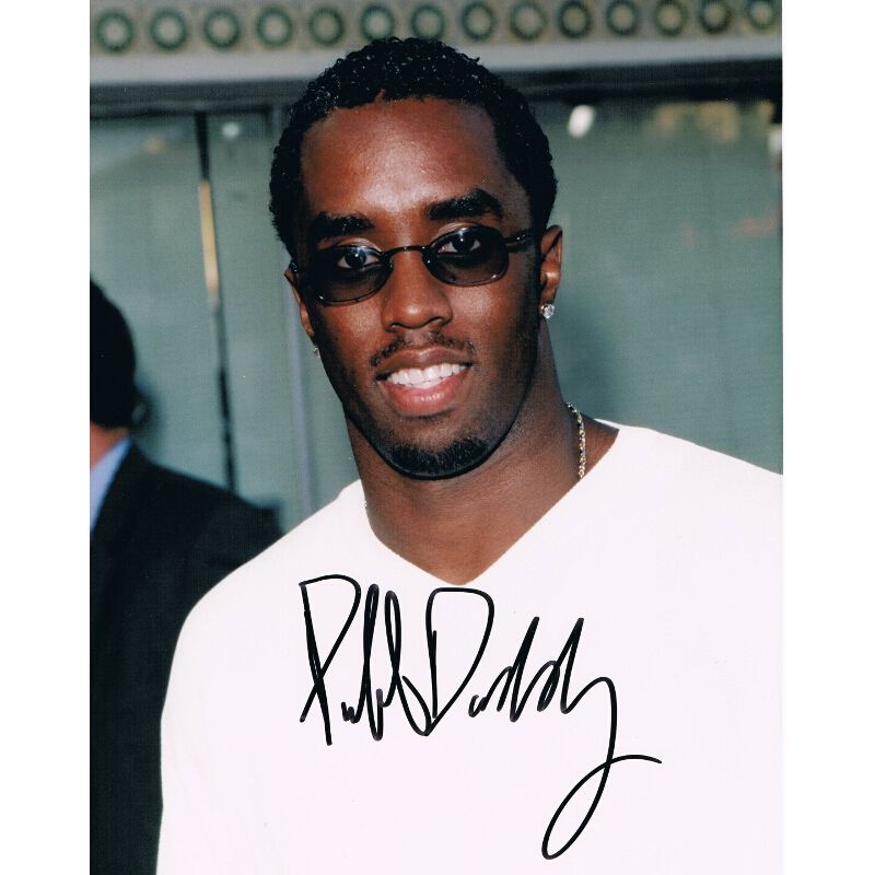 This is a 10" x 8" photograph of the rapper in a white shirt and sunglasses. P. Diddy has added his autograph in black ink across the bottom of the photograph.