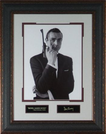 Sean Connery is best known for portraying the character James Bond, starring in seven Bond films between 1962 and 1983. The James Bond series focuses on a fictional British Secret Service agent created in 1953 by writer Ian Fleming. The Bond films are renowned for a number of features, including the musical accompaniment, with the theme songs having received Academy Award nominations on several occasions, and one win. Other important elements which run through most of the films include Bond's cars, his girls, his guns, and the gadgets with which he is supplied by Q Branch.A black and white 11X14 photo of Sean Connery as James Bond, custom matted and premium leather framed as shown with a plate, featuring the quote "BOND, JAMES BOND" and the Replica Engraved Signature of Sean Connery.