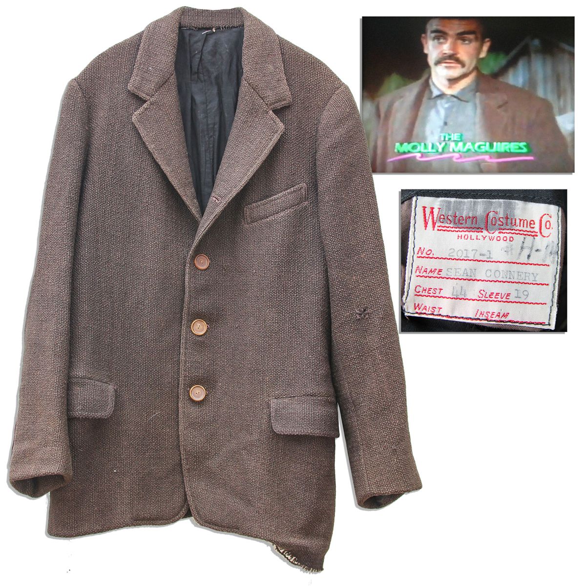 Sean Connery costume from the 1970 period piece, ''The Molly Maguires''. In the film, Connery played lead role as ''Black Jack'' Kehoe. Custom-made costume includes a heavy brown blazer with original ''Western Costume Co.'' tag sewn to inseam pocket and ''Sean Connery'' printed to tag. Jacket measures 19'' shoulder to shoulder x 36''. Coat is fraying along bottom hem and has a small hole to left sleeve. Very good.