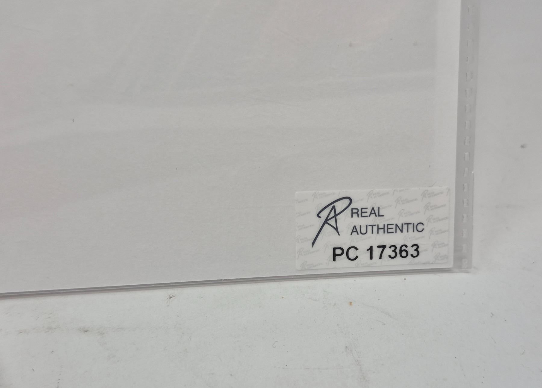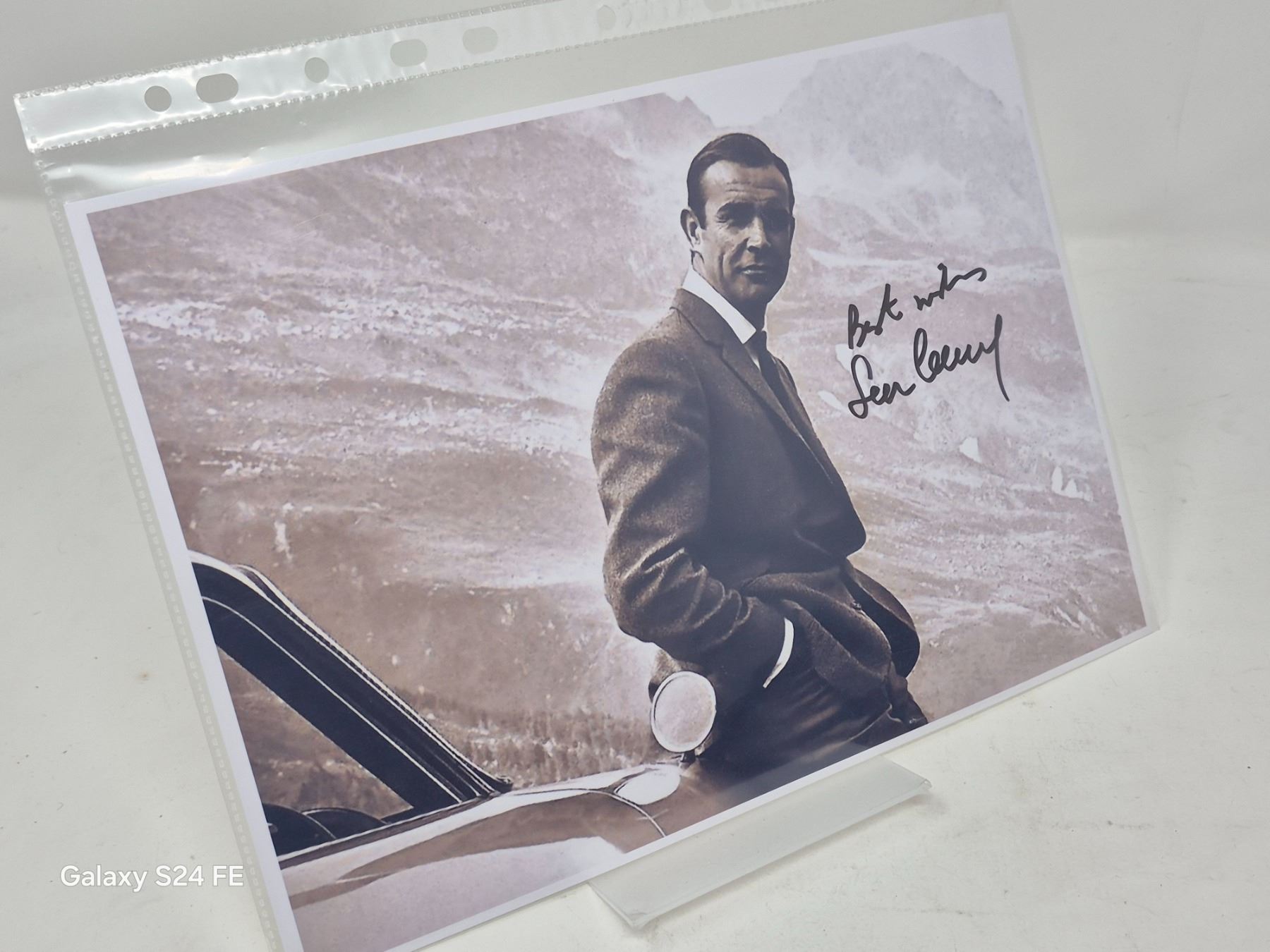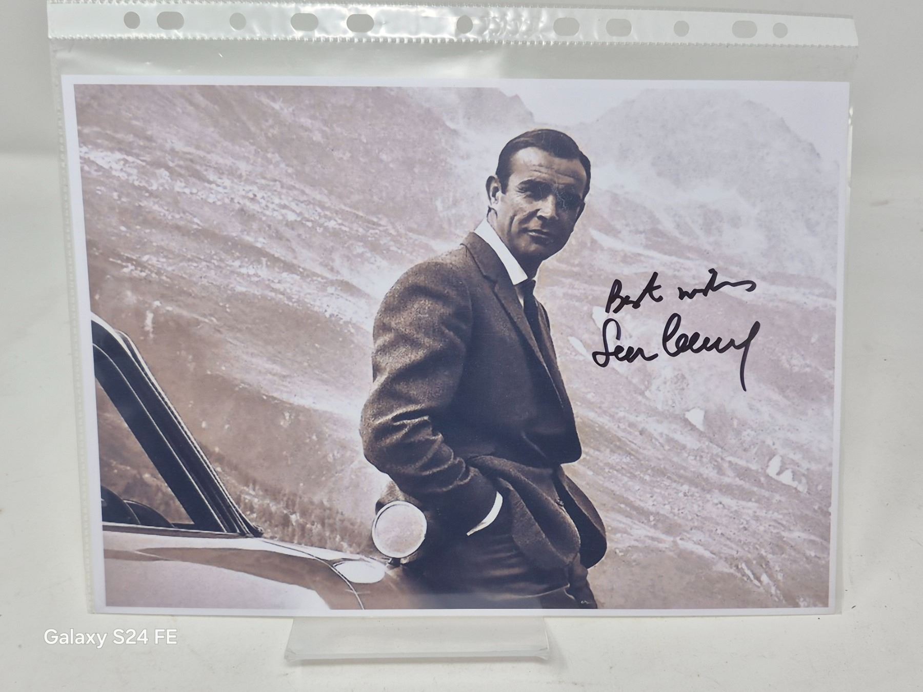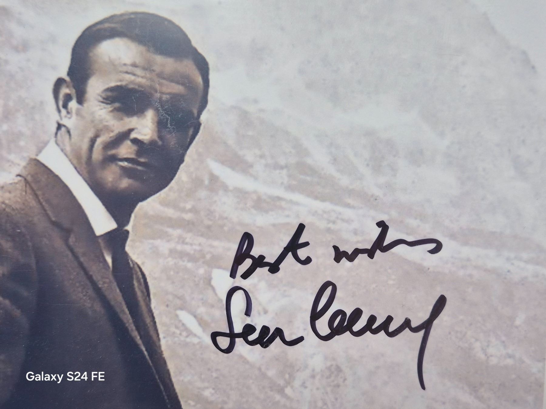 Vintage black-and-white portrait of Sean Connery as James Bond, hand-signed "Best wishes, Sean Connery" in black marker. Includes Real Authentic certification sticker PC 17363. A collector’s classic!