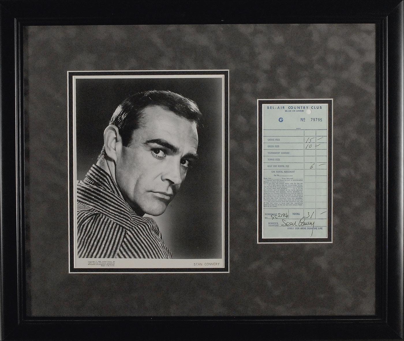 Bel-Air Country Club receipt, 3.25 x 7, no date, for a round of golf including caddie fees, green fees, and a cart rental totalling $31.00, signed at the bottom by Connery. Double suede matted and framed with a glossy 8 x 10 portrait of Connery, to an overall size of 20.5 x 17.5. In fine condition, with a few light creases and a punch hole to top right.