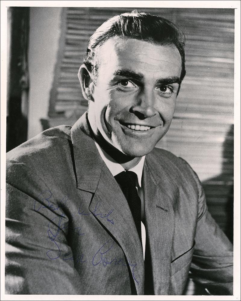 Handsome vintage glossy 8 x 10 photo, signed and inscribed in blue ink “Best wishes John, Sean Connery.” Scattered light creases and surface marks, otherwise fine condition.