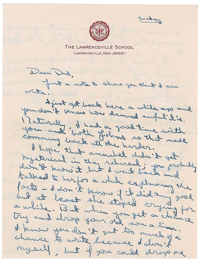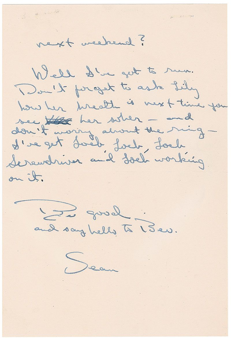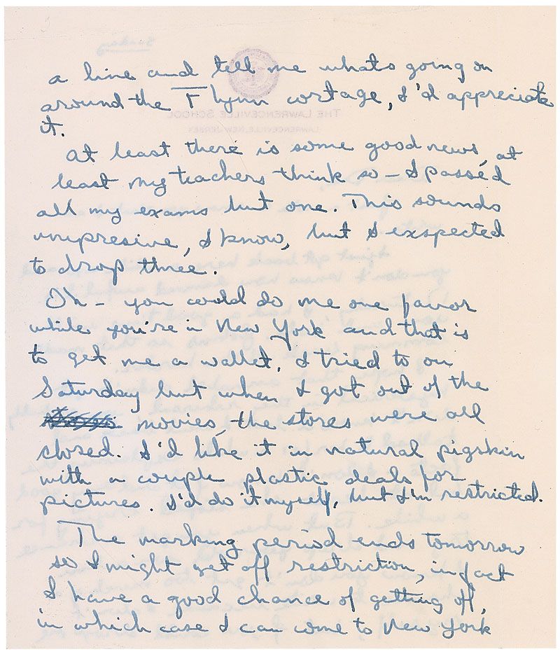 American actor and photojournalist (born 1941), son of Errol Flynn, who disappeared in Cambodia in 1970 during an assignment covering the Vietnam War. It is believed that Flynn was killed by the Khmer Rouge in 1971, and he was declared legally dead in 1984. ALS signed “Sean,” three pages on two adjoining sheets, 5.25 x 7, The Lawrenceville School letterhead, no date but circa late 1950s. Letter to his father, Errol Flynn. In part: “Just a note to show you that I can write. I just got back here a while ago and you don’t know how damned awful it is…I hope that Annabel didn’t get hysterical in the rehearsal…I went back and talked to her for a while explaining the facts—I don’t know if it did any good but at least she stopped crying for a while…if you could drop me a line and tell me what’s going on around the Flynn cortege, I’d appreciate it.” In fine condition, with staple holes to the upper border of the last page.