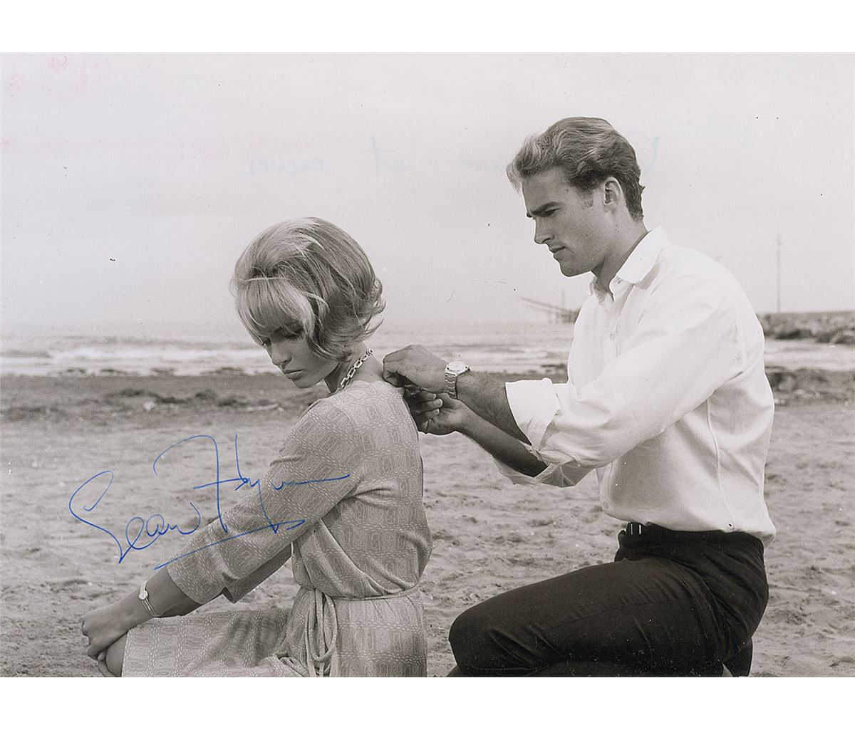 American actor and photojournalist (born 1941), son of Errol Flynn, who disappeared in Cambodia in 1970 during an assignment covering the Vietnam War. It is believed that Flynn was killed by the Khmer Rouge in 1971, and he was declared legally dead in 1984. Glossy 9 x 6.75 photo of Flynn from the 1964 film Mission to Venice, signed in blue ink. In fine condition, with evenly trimmed edges, trivial soiling to upper left corner, and slight show-through from writing to reverse.