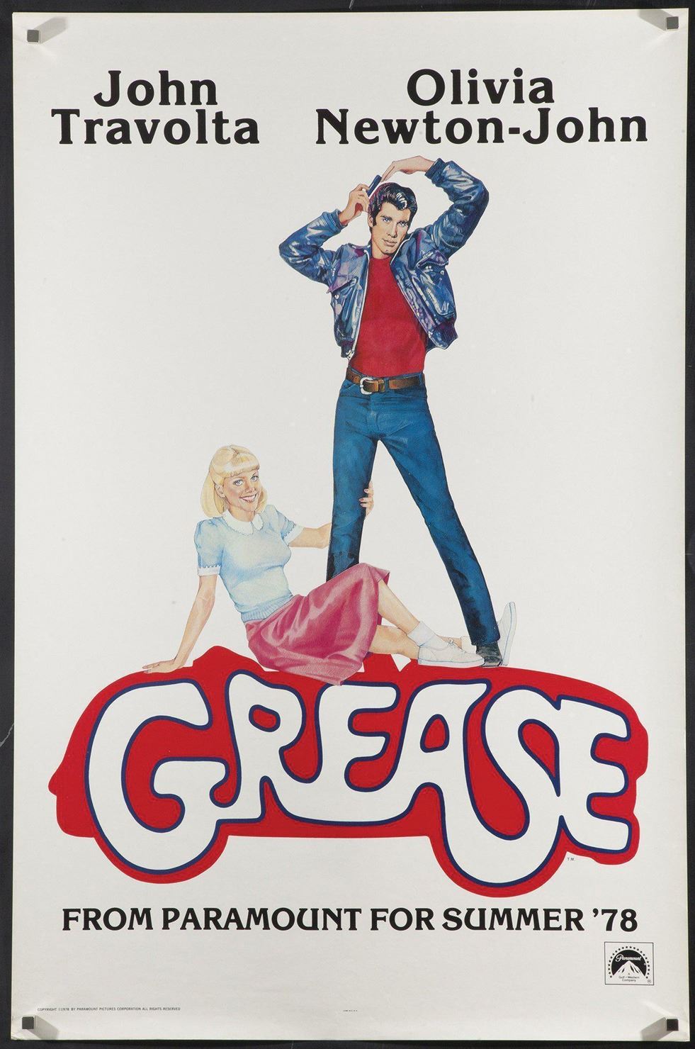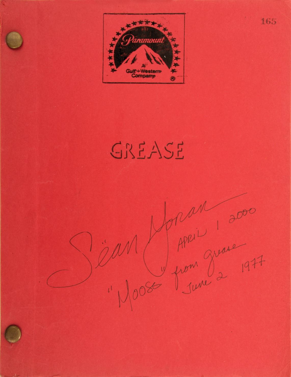 148. Sean Moran "Moose" personal signed shooting script from Grease. (Paramount, 1977) Vintage original 110pp 4th draft shooting script for Grease, written by Bronte Woodard, signed on front cover by Sean Moran "Moose". In red printed studio wraps, and composed of white, blue, and pink correction pages. Interior remains fresh and essentially unhandled; cover has slightly rounded corners and tiny wrinkles. Very good to fine condition. $300 - $500