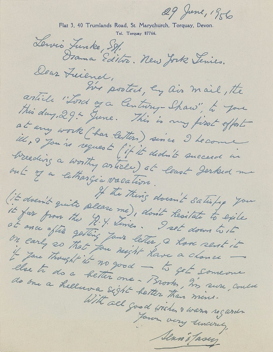 Irish playwright (1880-1964) best known for such working-class dramas as The Plough and the Stars and Juno and the Paycock. ALS, one page, 7 x 9, personal letterhead, June 29, 1956. Letter to Lewis Funke, the drama editor at the New York Times. In part: “I’ve posted, by air mail, the article ‘Lord of a Century—Shaw,’ to you…This is my first effort at any work (bar letters) since I became ill, & you’re [sic] request (if it didn’t succeed in breeding a worthy article) at least jerked me out of a lethargic vacation. If the thing doesn’t satisfy you (it doesn’t quite please me), don’t hesitate to exile it far from the N. Y. Times.” In fine condition. Accompanied by a full letter of authenticity from PSA/DNA.