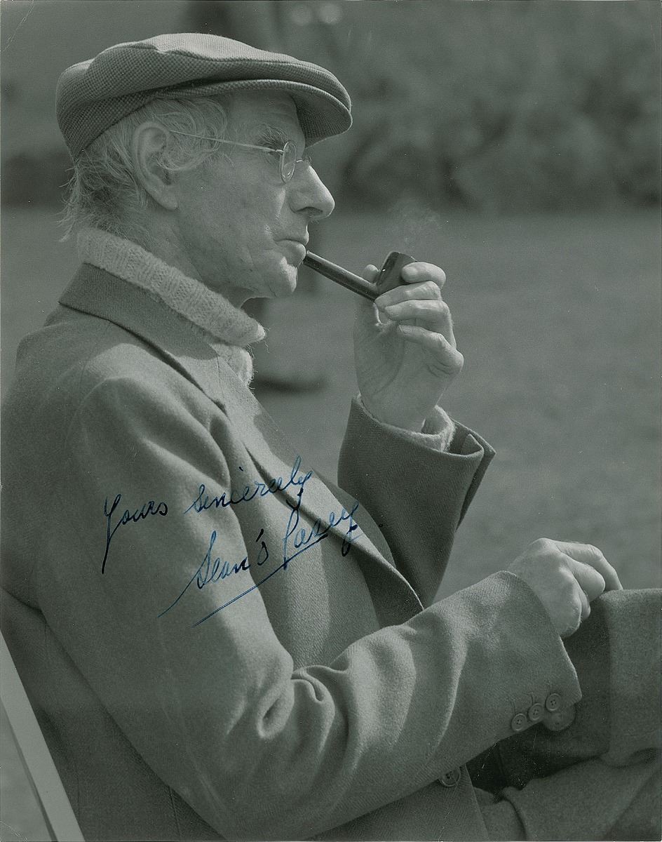 Rare pearl-finish 7.75 x 9.5 portrait of O’Casey smoking a pipe, signed in fountain pen, “Yours sincerely, Sean O’Casey.” In very good to fine condition, with scattered creases and a paperclip impression to the top edge. Accompanied by the original mailing envelope addressed in O’Casey’s hand, incorporating his surname in the return address on the reverse. The first example of an actual O’Casey signed photo we have offered.