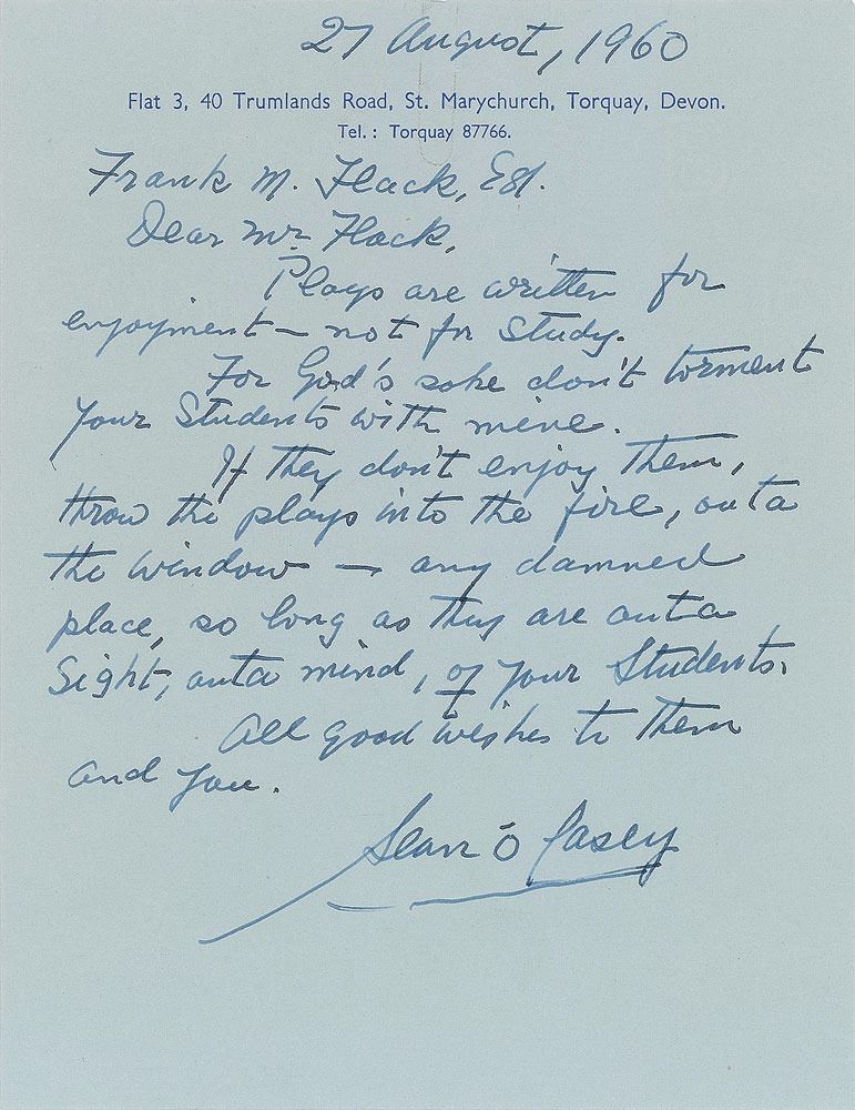 ALS, one page, 5.25 x 7, personal letterhead, August 27, 1960. Letter to Frank M. Flack, in part: "Plays are written for enjoyment-not for study. For God's sake don't torment your students with mine. If they don't enjoy them, throw the plays into the fire, out a window-any damned place, so long as they are outa sight, outa mind, of your students." In fine condition.