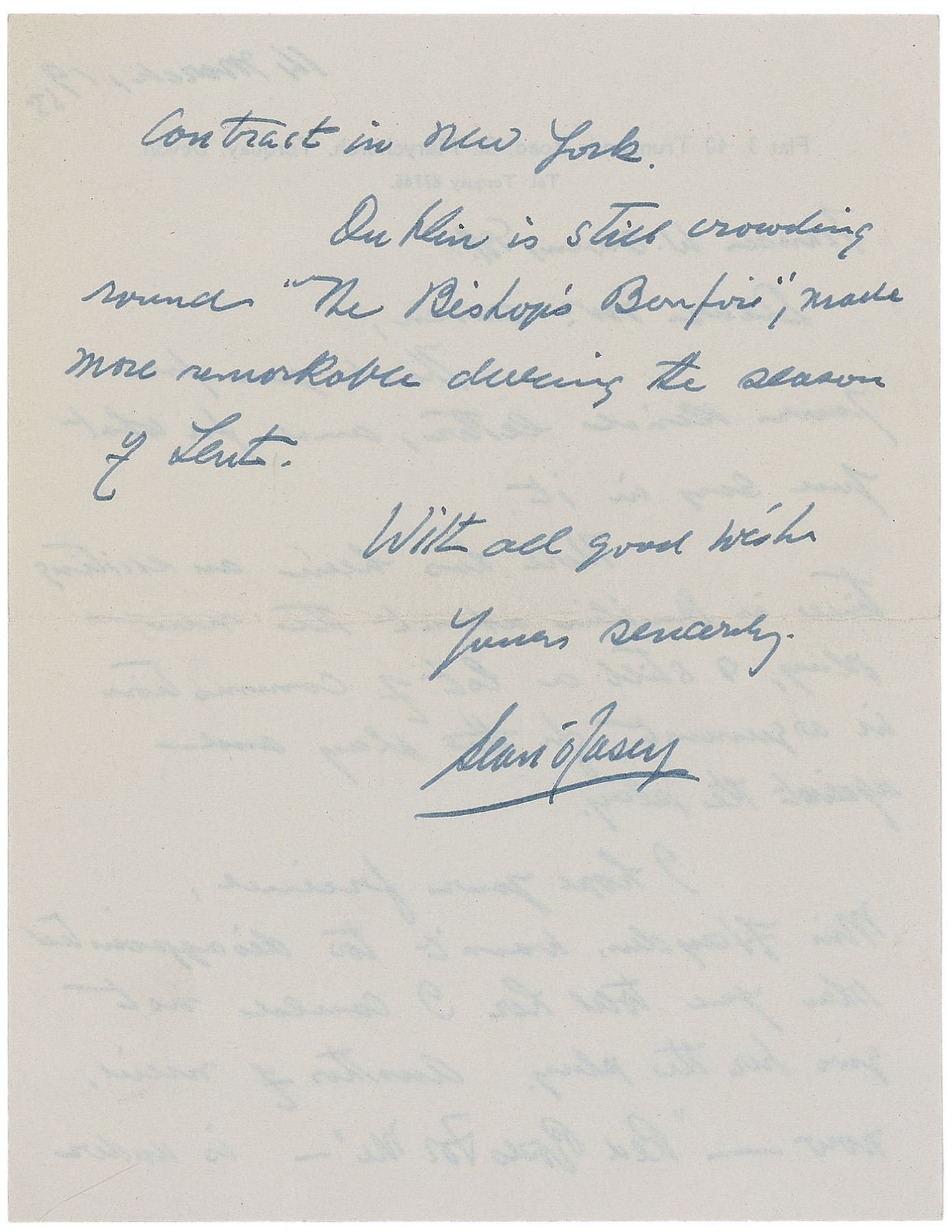 Irish playwright (1880-1964) best known for such working-class dramas as The Plough and the Stars and Juno and the Paycock. ALS, one page both sides, 5.5 x 7, St. Marychurch letterhead, March 14, 1953. Letter to Francis Owen, in part: “There has been an exciting time in Dublin about the new play, & still a lot of commotion in argument for the play and against the play. I hope your friend, Miss Hayden, wasn’t too disappointed when you told her I could not give her the play. Another of mine now—‘Red Roses For Me’—is under contract in New York. Dublin is still crowding round ‘The Bishop’s Bonfire,’ made more remarkable during the season of Lent.” In fine condition.