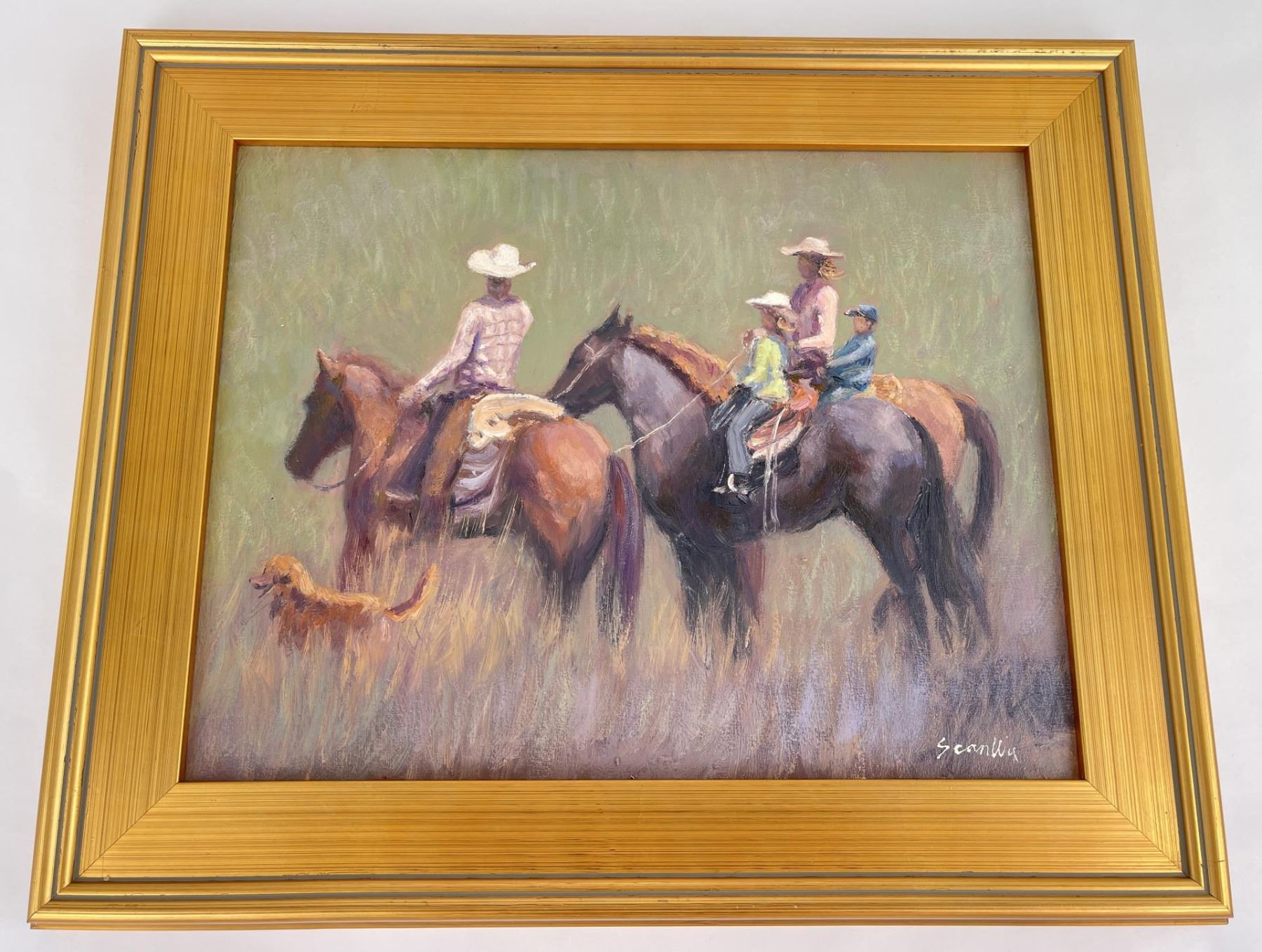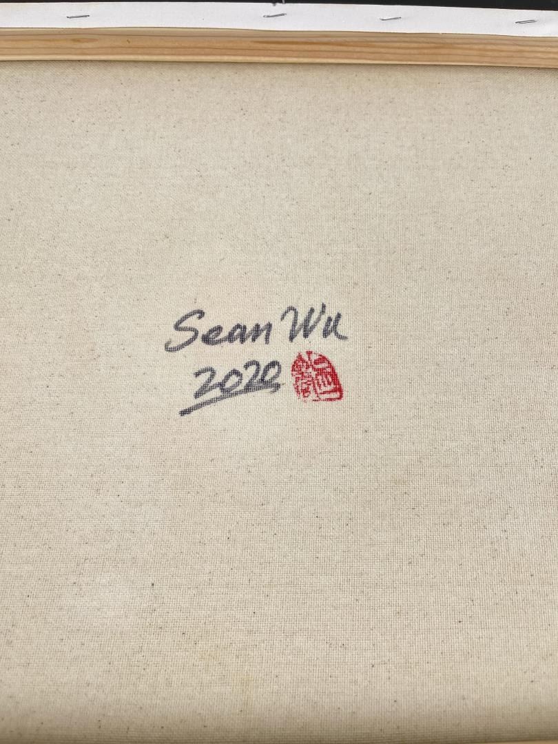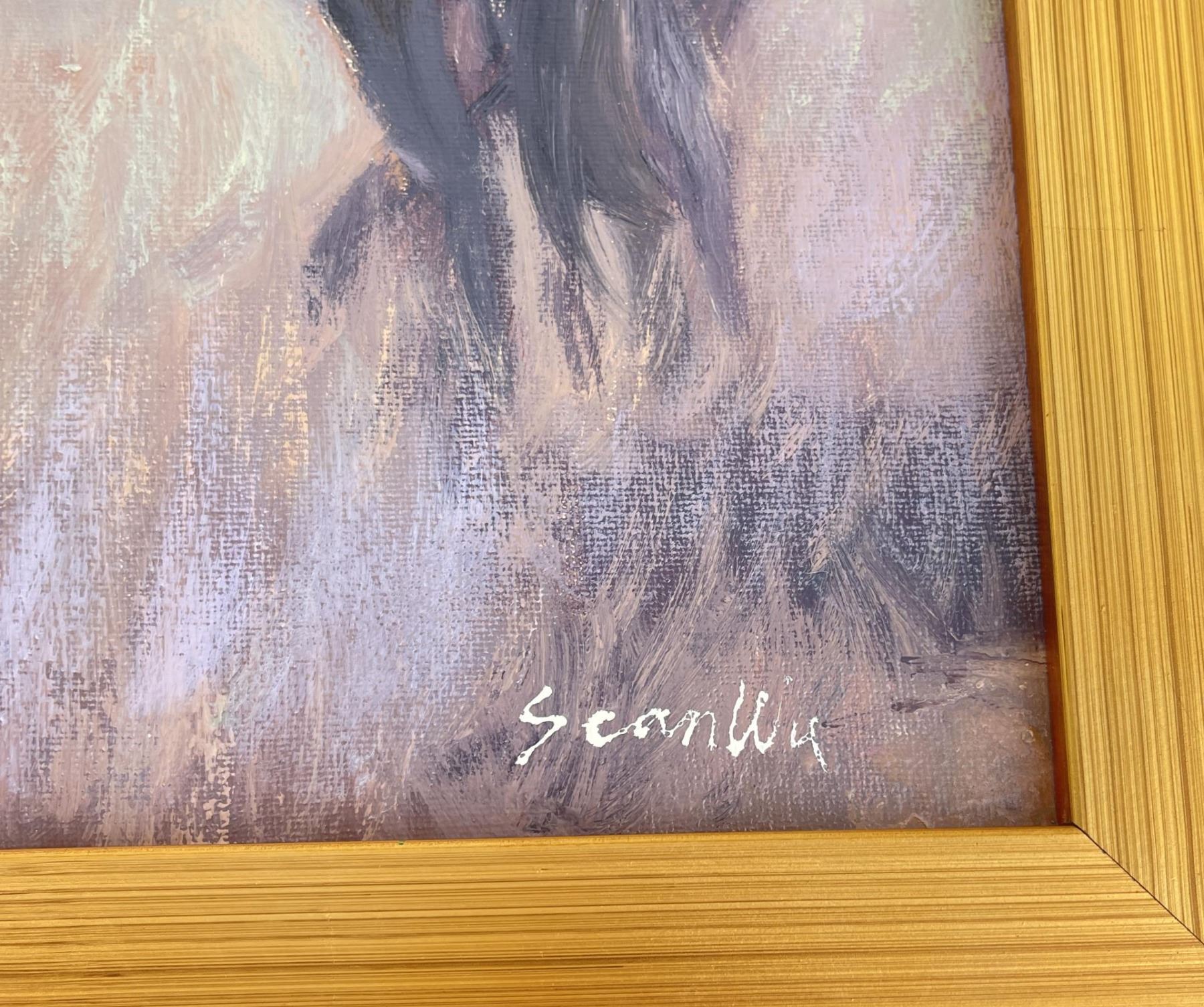 19" by 23" framed. Title is Home on the Range. Sean Wu was born in Beijing, China in 1954 and moved to the United States in 1987 to pursue a graduate degree in Computer Science. He worked as a software engineer for 30 years before retiring in 2020. In his free time, Sean is a self-taught painter who has been pursuing his passion for art since childhood. While working full-time as a software engineer, Sean dedicated his evenings, weekends, and holidays to painting. He began his artistic journey as a realist portrait artist and has since migrated to realist-impressionist landscape animal portraiture. Sean has experimented with various techniques, from using a palette knife to different brush styles, and has explored different color palettes, ranging from realism to impressionism. His favorite painting subject is horses, and he strives to capture their beauty and strength in his work. Since retiring, Sean now paints as a full-time artist daily, with a focus on creating and sharing his art with the world. He plans to continue painting for the rest of his life, leaving behind a legacy of stunning artwork.