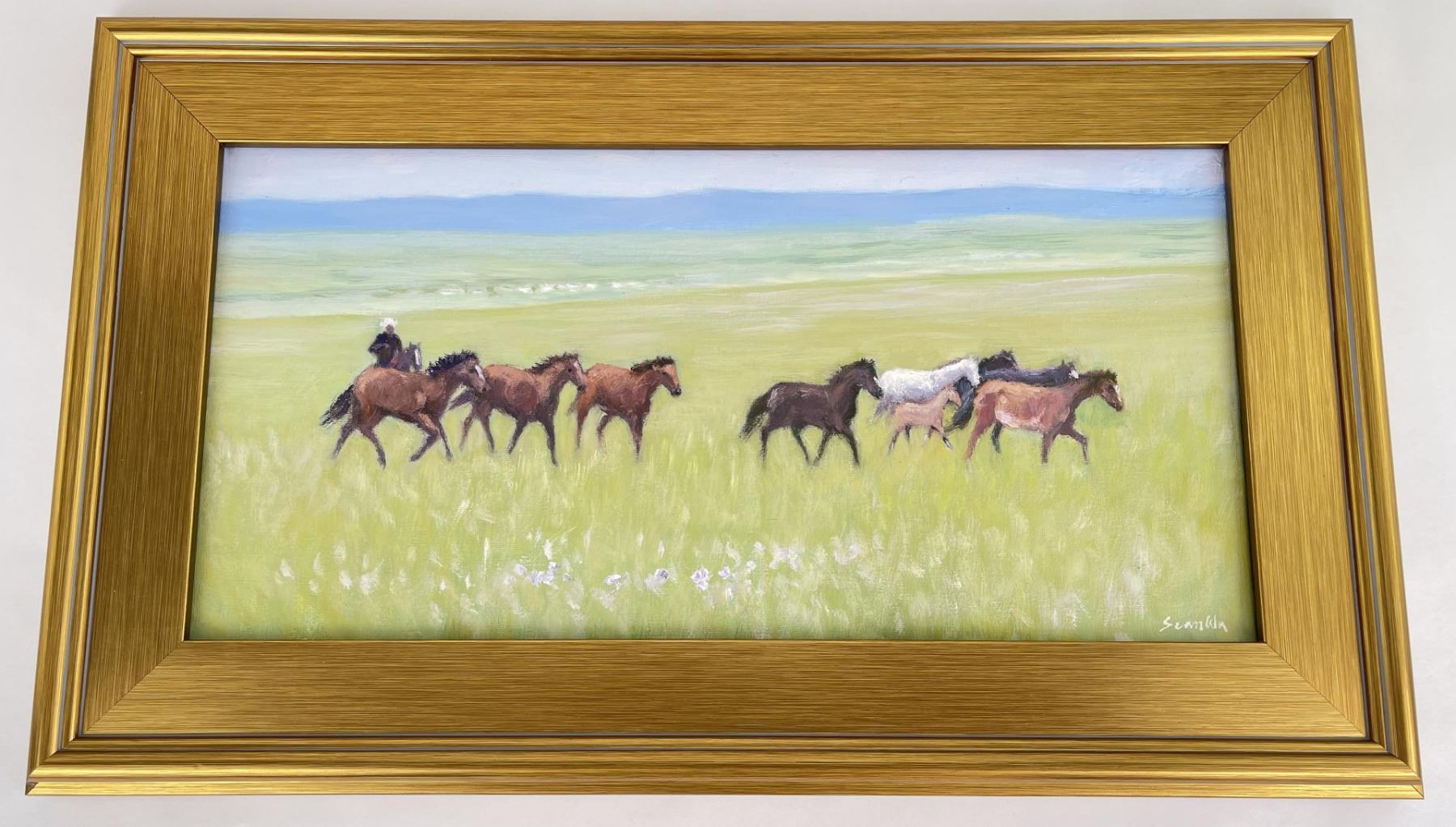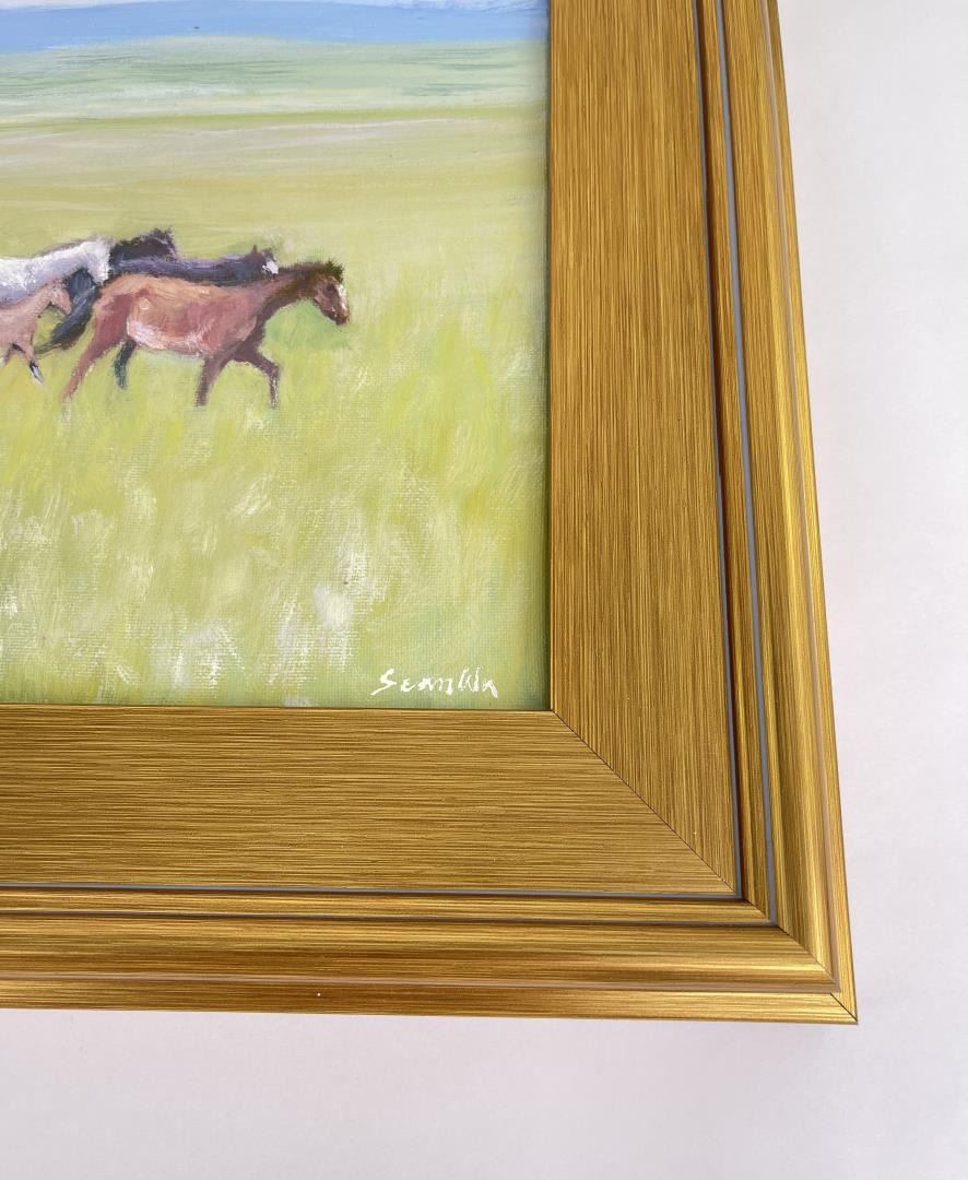 16" by 25" framed. Title is Herding Broncs. Sean Wu was born in Beijing, China in 1954 and moved to the United States in 1987 to pursue a graduate degree in Computer Science. He worked as a software engineer for 30 years before retiring in 2020. In his free time, Sean is a self-taught painter who has been pursuing his passion for art since childhood. While working full-time as a software engineer, Sean dedicated his evenings, weekends, and holidays to painting. He began his artistic journey as a realist portrait artist and has since migrated to realist-impressionist landscape animal portraiture. Sean has experimented with various techniques, from using a palette knife to different brush styles, and has explored different color palettes, ranging from realism to impressionism. His favorite painting subject is horses, and he strives to capture their beauty and strength in his work. Since retiring, Sean now paints as a full-time artist daily, with a focus on creating and sharing his art with the world. He plans to continue painting for the rest of his life, leaving behind a legacy of stunning artwork.
