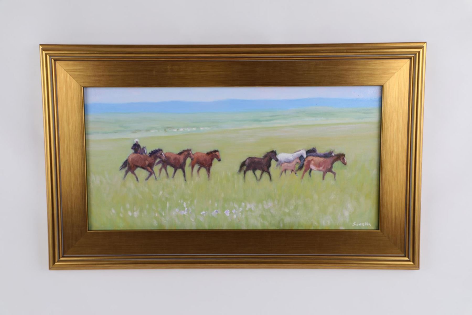 16" by 25" framed. Title is Herding Broncs. Sean Wu was born in Beijing, China in 1954 and moved to the United States in 1987 to pursue a graduate degree in Computer Science. He worked as a software engineer for 30 years before retiring in 2020. In his free time, Sean is a self-taught painter who has been pursuing his passion for art since childhood. While working full-time as a software engineer, Sean dedicated his evenings, weekends, and holidays to painting. He began his artistic journey as a realist portrait artist and has since migrated to realist-impressionist landscape animal portraiture. Sean has experimented with various techniques, from using a palette knife to different brush styles, and has explored different color palettes, ranging from realism to impressionism. His favorite painting subject is horses, and he strives to capture their beauty and strength in his work. Since retiring, Sean now paints as a full-time artist daily, with a focus on creating and sharing his art with the world. He plans to continue painting for the rest of his life, leaving behind a legacy of stunning artwork.