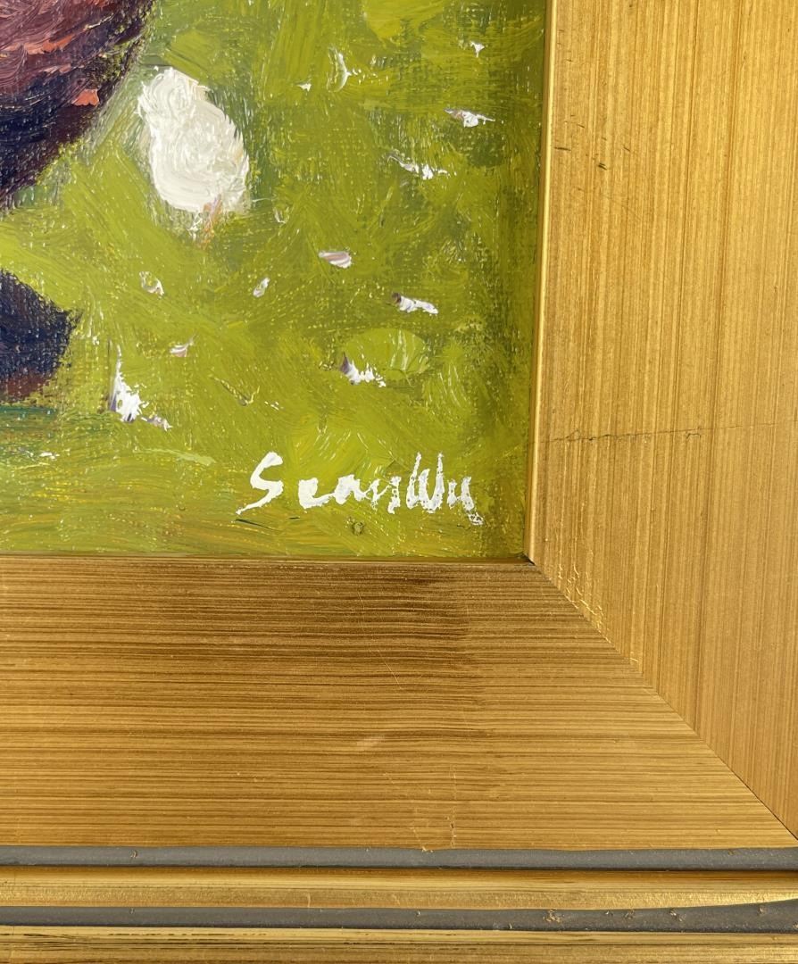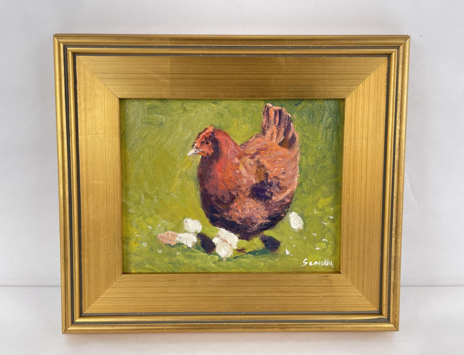 13" by 15" framed. Title is Mother Hen. Sean Wu was born in Beijing, China in 1954 and moved to the United States in 1987 to pursue a graduate degree in Computer Science. He worked as a software engineer for 30 years before retiring in 2020. In his free time, Sean is a self-taught painter who has been pursuing his passion for art since childhood. While working full-time as a software engineer, Sean dedicated his evenings, weekends, and holidays to painting. He began his artistic journey as a realist portrait artist and has since migrated to realist-impressionist landscape animal portraiture. Sean has experimented with various techniques, from using a palette knife to different brush styles, and has explored different color palettes, ranging from realism to impressionism. His favorite painting subject is horses, and he strives to capture their beauty and strength in his work. Since retiring, Sean now paints as a full-time artist daily, with a focus on creating and sharing his art with the world. He plans to continue painting for the rest of his life, leaving behind a legacy of stunning artwork.