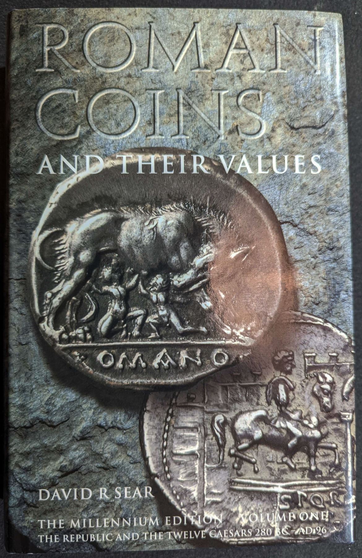 Sear, David R. ROMAN COINS AND THEIR VALUES - MILLENNIUM EDITION VOLUME ONE. Spink and Son Ltd. 2000. 8vo. 532-pages. London. Original blue cloth, gilt, dust jacket. b&w plated and line drawings throughout. Fine. Inscribed by the author. This book is a catalog and guide to Roman coins. The catalogue entries have been expanded to include a virtually complete listing of the entire Roman Republican series, as well as more comprehensive coverage of the much larger and more complex Imperial series. Greater emphasis is now placed on the precise chronology and place of mintage of each type and extensive coverage is given to the important series of billon and bronze coins struck at Alexandria over a period of more than 300 years. The valuations have been exhaustively researched from recent auction records and fixed price catalogues and many professional numismatists have contributed their valuable opinions on specific series. Prices (both in British pounds and US dollars) are now expressed in either two or three grades of preservation for each entry, usually 'VF' and 'EF' for precious metal issues, and 'F', 'VF' and 'EF' for Imperial bronzes. Perhaps most importantly, the number of photographic illustrations in the text has been increased, and their quality improved. The latest editions of this standard reference. Lot weight: 2 lbs 4oz. Subject(s): Ancient Coinage.