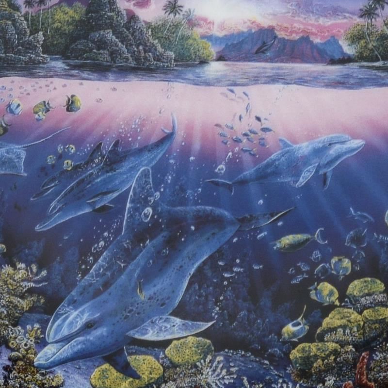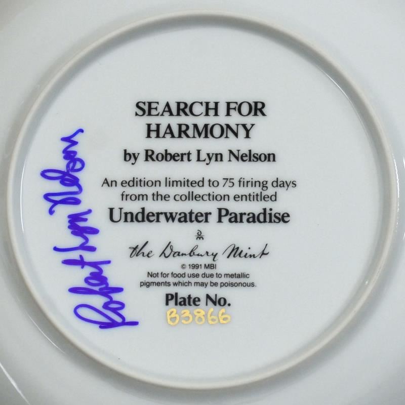"Search for Harmony" is a porcelain collectors plate from the Underwater Paradise edition, hand signed and numbered inverso by the artist Robert Lyn Nelson. These limited edition plates were issued by The Danbury Mint in 1991 and each has matching serial numbers on the reverse and are trimmed with 23ct gold. This plate is for decorative use only. Includes Certificate of Authenticity. Measures approx. 8" (diameter).