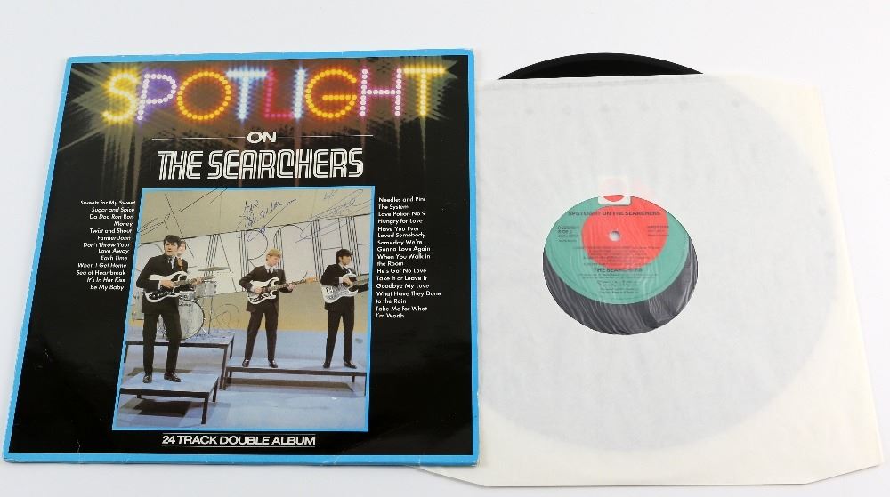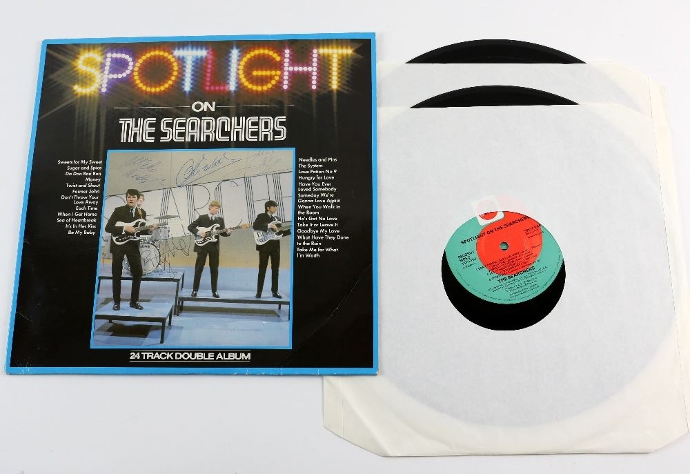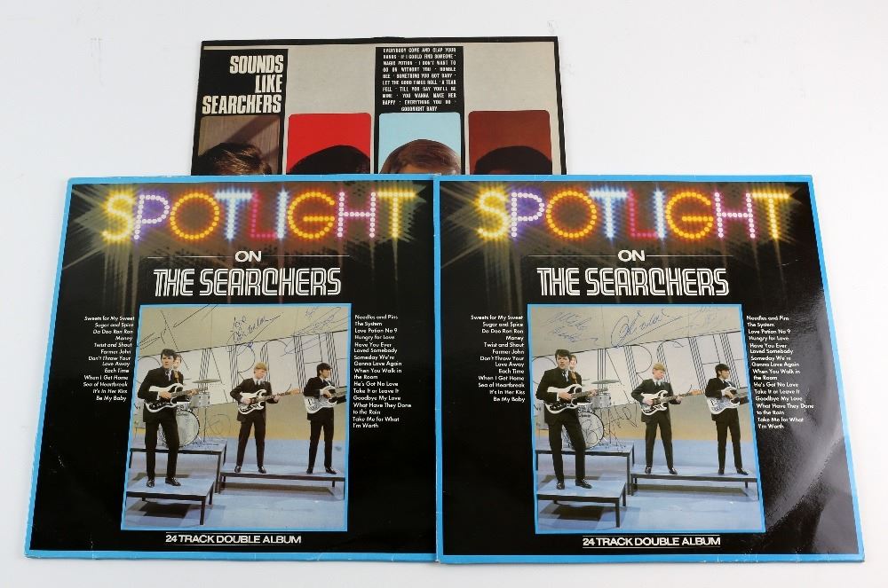 Searchers - Spotlight on the Searchers, two double LP album covers signed by all four members, one cover with two disks and the other with one, also, Sounds Like Searchers, LP album cover signed by four, with LP.