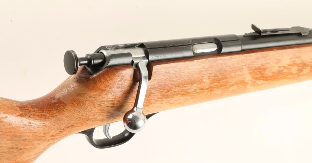 Blued, black plastic and wood bolt-action, single-shot rifle with a 22" barrel, elevation adjustable rear sight, wood tock with buttplate. Bluing has edge wear and show freckling from surface rust. Black plastic trigger guard has a few scuff marks. Wood stock has no chips or cracks but is worn with rubs and scuffs. Action requires manual cocking of striker after the bolt is closed and it works well. Bore is shiny with good rifling. Condition is good. *Modern Firearm*