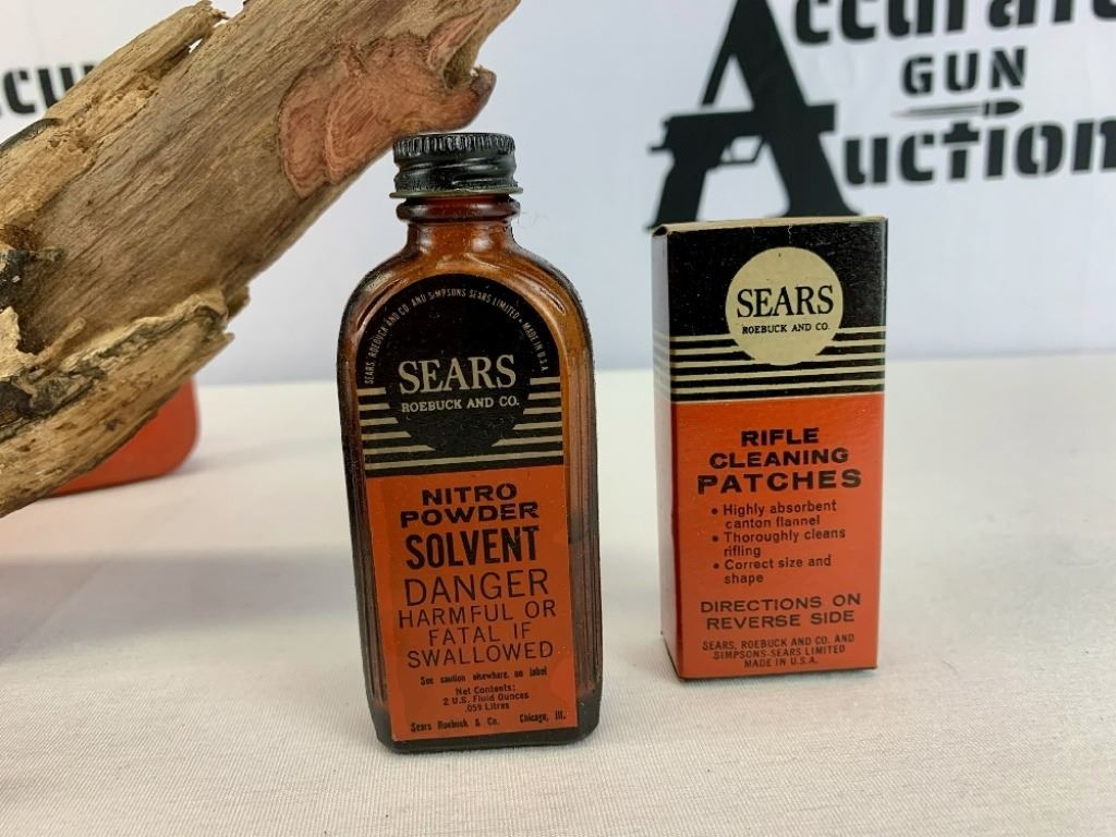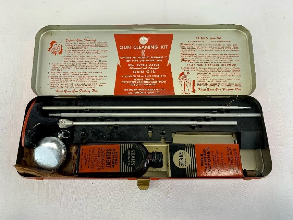 This is a vintage Sears Roebuck and Company rifle/gun cleaning kit. It is a metal case that measures 12 3/4 inches across, 4 1/4 inches down and 1 1/4 inches high. It has Sears Roebuck and Co. on the top of case