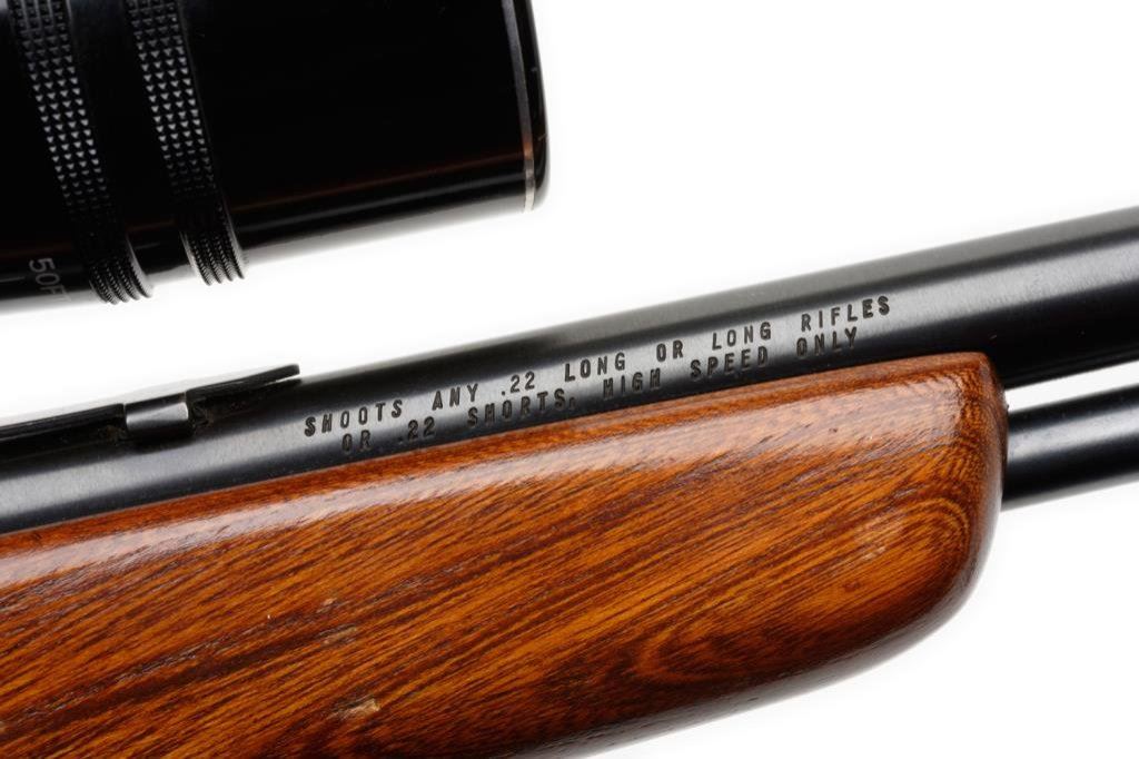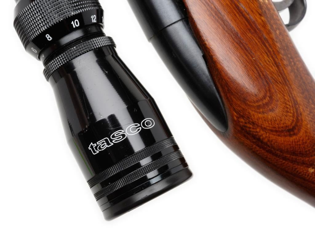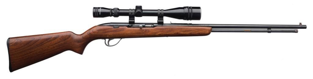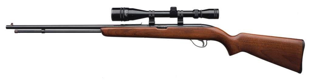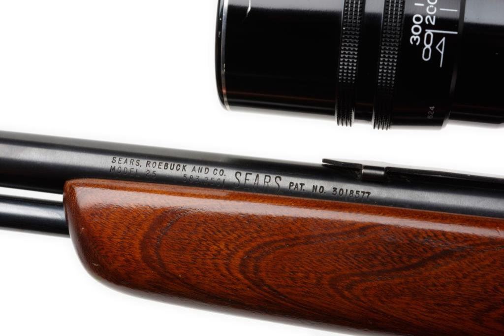 *Sears Model 25 semi-automatic rifle, .22 caliber, 22.5” round barrel, no visible S/N, blued finish, wood stock, mounted with a Tasco 6-24X40 scope displaying crisp optics. This rifle is in overall fine condition showing little use. Est.: $100-$200.