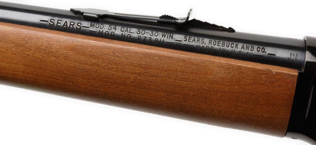 *Sears Model 54 lever action carbine, .30-30 Win. caliber, 20” round barrel, S/N V55804, black finish, wood stocks, receiver tapped on right side for scope mounts; in overall fine condition showing little use. Est.: $200-$400.