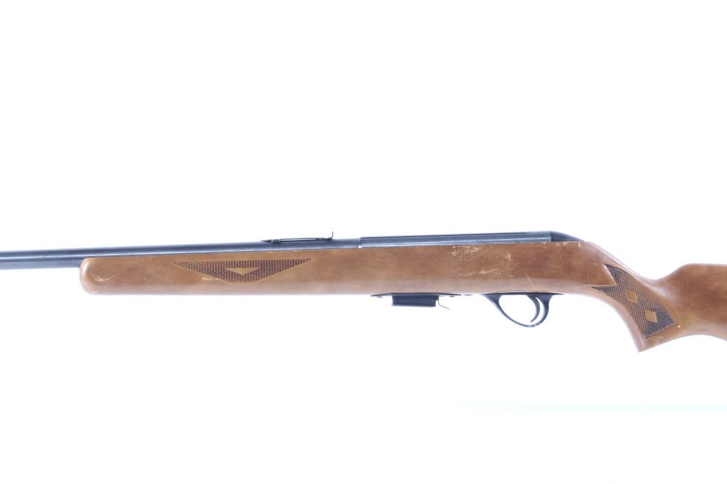 This lot features a Sears & Roebuck Model 101.52772 .22 Magnum Rifle. This rifle features a 20" barrel, one 5 round magazine, adjustable sight, hardwood stock, and blue'd finish. This rifle is a Sear & Roebuck branded Savage 34M. The rifle is in good condition, showing little wear and use. The mechanics are tight and fully functioning. The bore is shiny with good rifling. The rear sight elevator ramp is missing. This is a Curio & Relic firearm. FFL transfer or NICS background check required. No Serial number