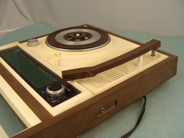 This is a vintage Sears portable record player plays 33's, 45's, and even old-time 78's. It was made in Japan in the 1960's. The phonograph is working fine on all speeds. The speaker is a little scratchy on low volume, so turn it up and it plays loud and clear. It includes a raising center insert, and earphone jack. The case is off-white and brown, with handle and removable cover. It operates with the plug, or 4 D cell batteries. The dimensions are 11" x 14" x 4".