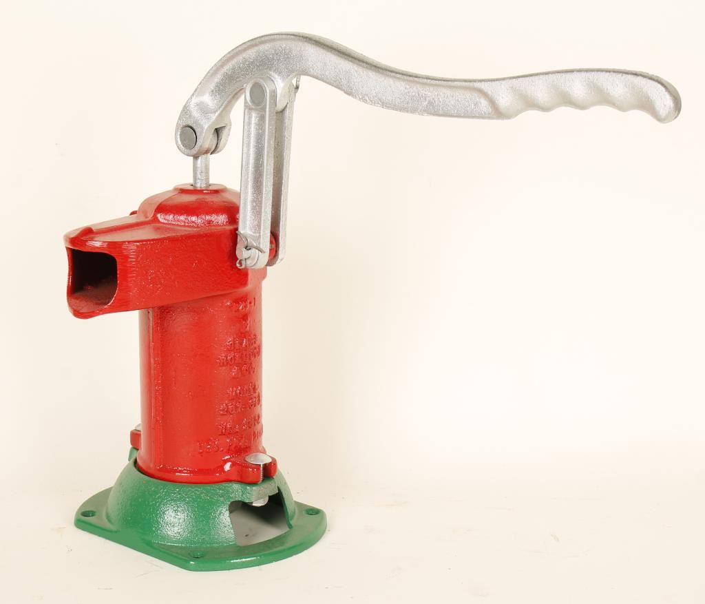 Vintage cast iron well pump, newly painted red, green, and silver. Reads " Sears Roebuck & Co. Model 261-691" Measures 15" x 9" x 7".