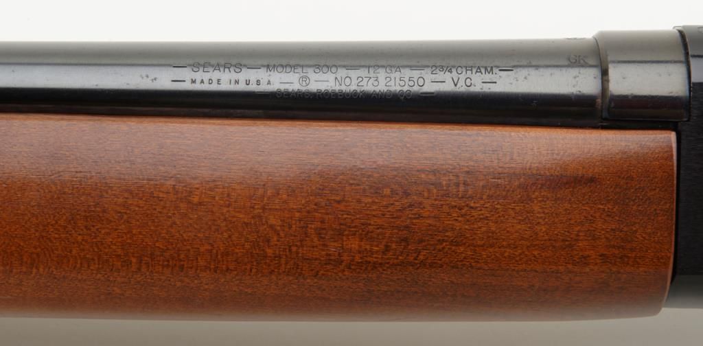 Sears model 300 12 Ga. semi auto shotgun, #21867, 26" barrel with Cutts style external choke. Shotgun is in fine to near excellent condition showing little use. Bore is mirror bright, action is good. Stock shows minor mars and dings from storage and use. Est. $50-100. (Modern)