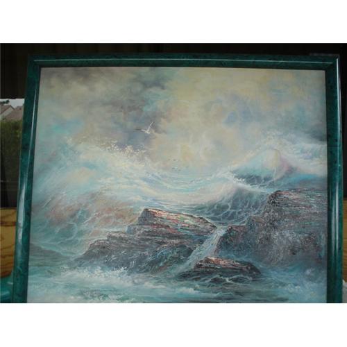 20th.c American. Oil on canvas signed illegibly. Measures 20"x24". Very colorful seascape. Framed. Light scratch upper Right.