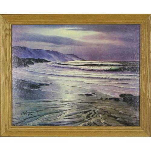 This beautiful print displays the unique technique of layers of paint creating distance and perspective. A sandy shore turns into a patterned array of ocean foam, giving way to soft, translucent breakers folding onto the beach, then powerful waves, and finally into the calm, smooth distant ocean horizon. Brilliant hues of purple dominate the calm scene in this picture that is well framed in a light stained wood frame. The entire size of the piece ...