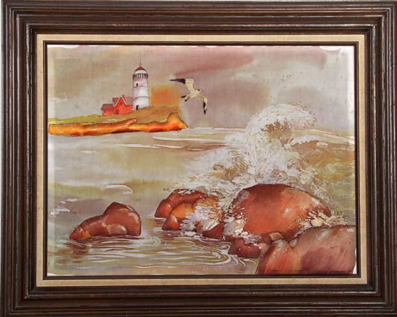 Seascape with Lighthouse, Watercolor on Canvas with Embroidery
