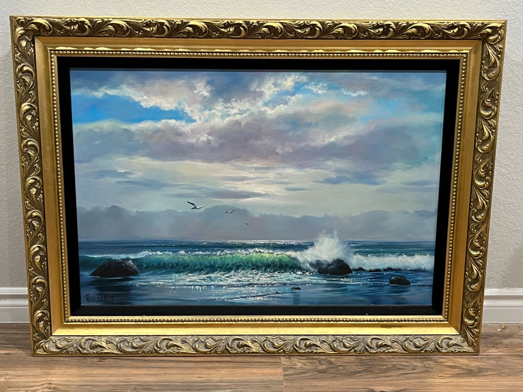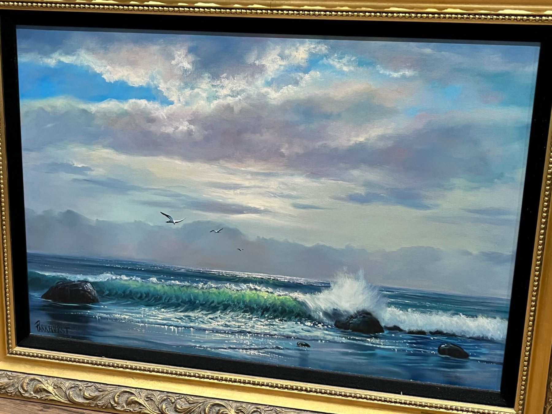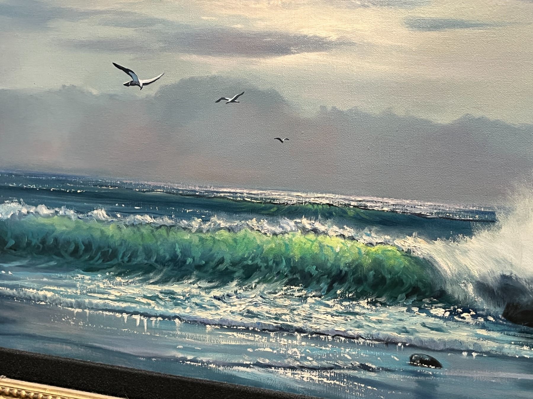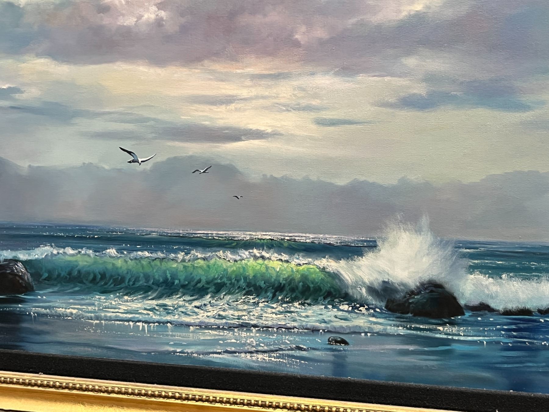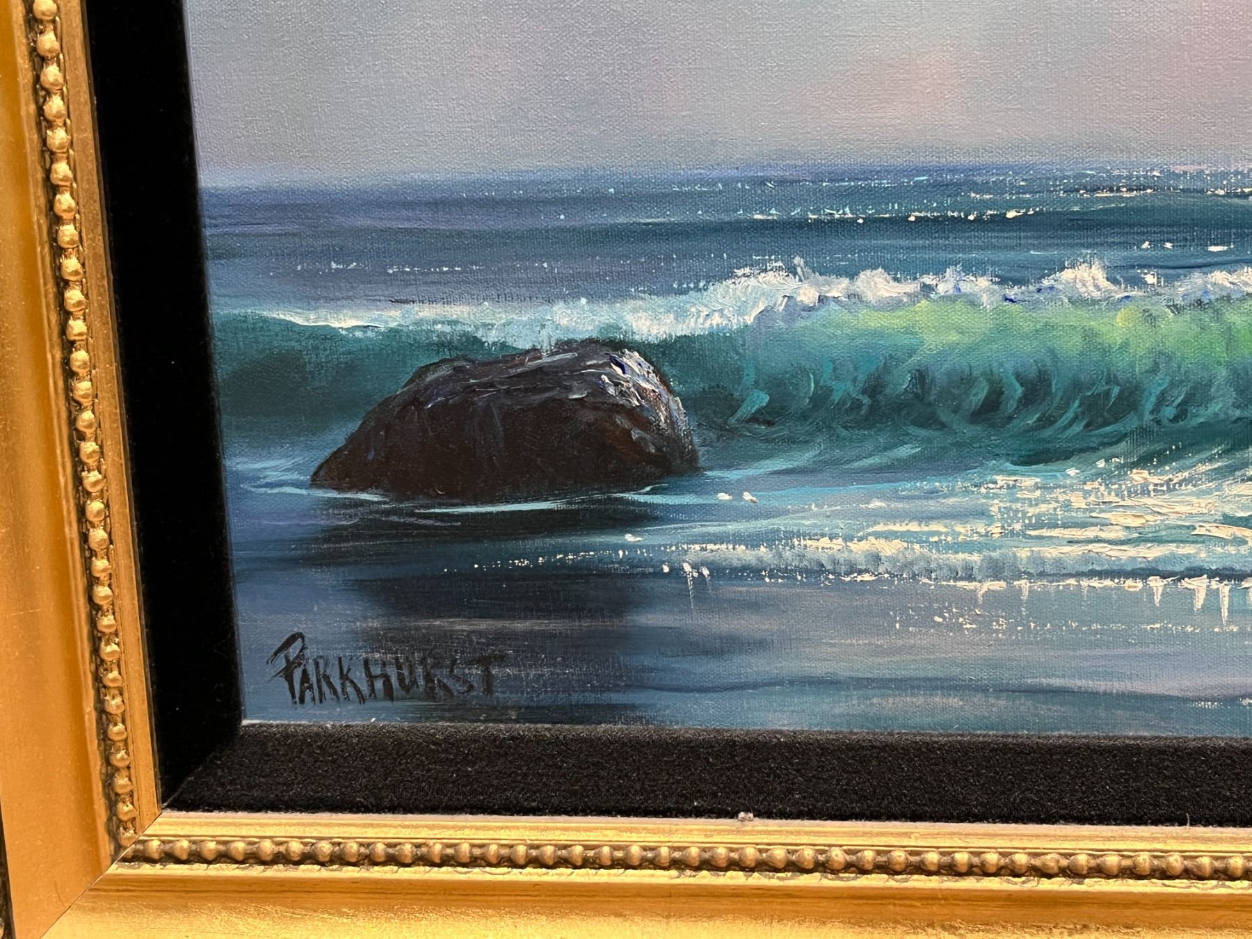APPRAISER FAIR MARKET VALUE: $500 - "Seascape with Purple Sky and Seagulls** by Violet Parkhurst (1921-2008): Oil on canvas circa 1970s. Hand-signed by the artist. Measures approximately 24" high by 36* wide unframed and 34" high by 46" wide framed. LT62