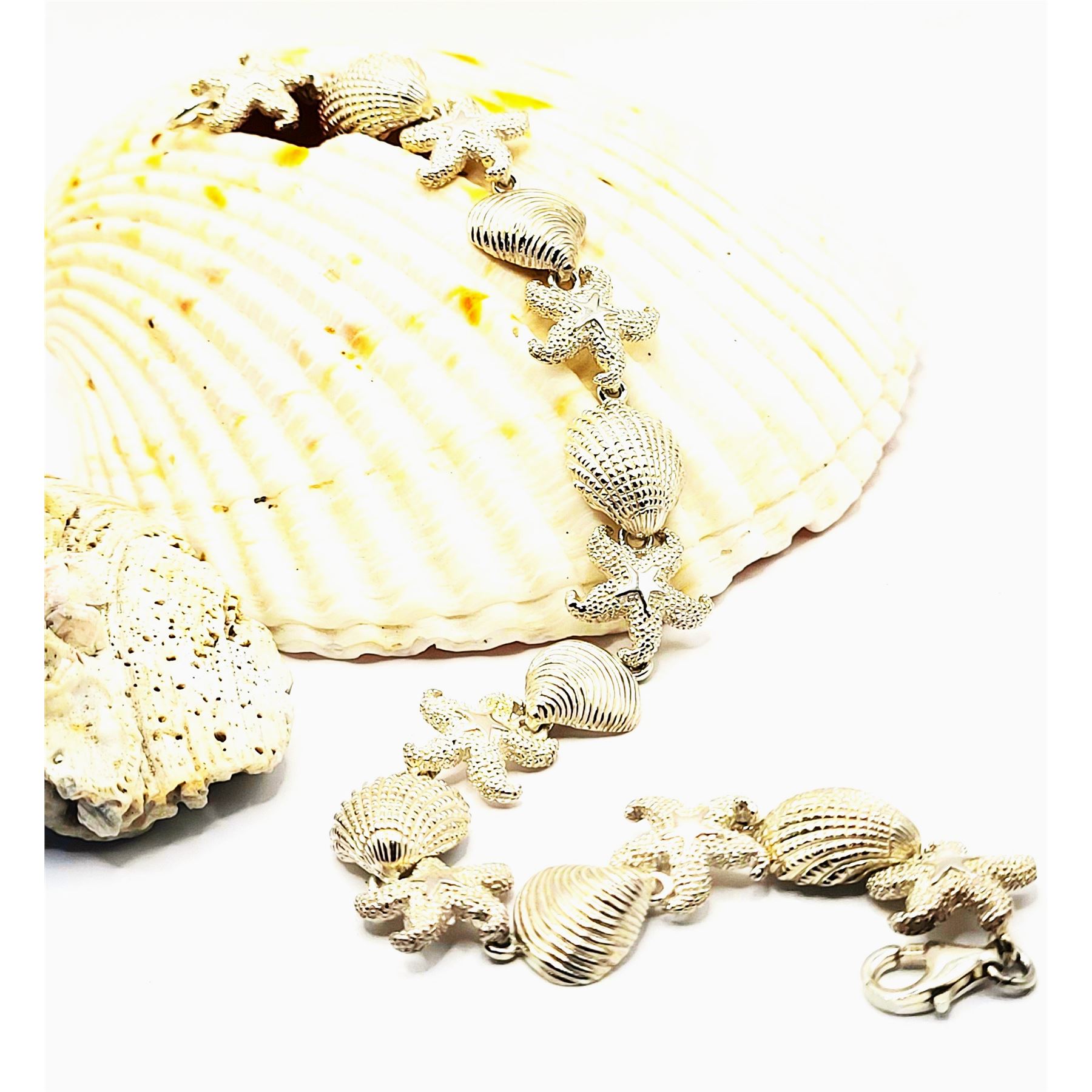 This is a sterling silver bracelet with a nautical motif. Each link of the bracelet represents a cockle shell, sand dollar, starfish, or scallop shell continuously for 7.5", ending with a lobster clasp. The bracelet is approximately 5/8" long. Admin: 33121/1bg