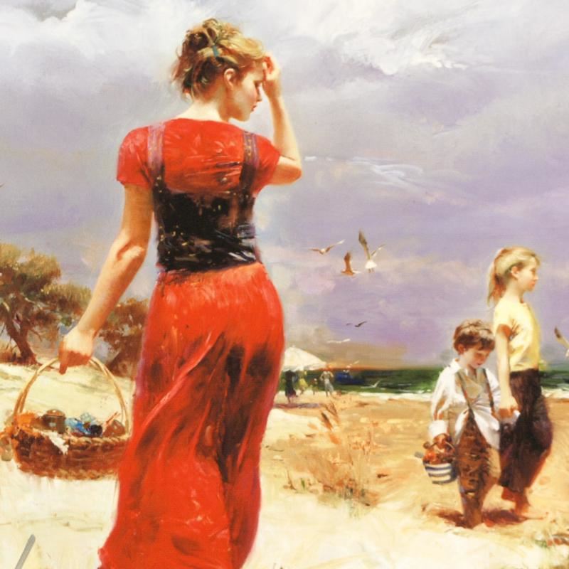"Seaside Gathering" is a limited edition giclee on canvas, numbered and hand signed by Pino (1939-2010). Includes Certificate of Authenticity! Measures approx. 12" x 12" (image).