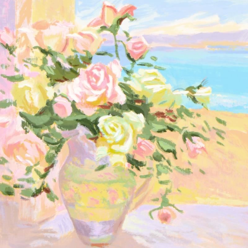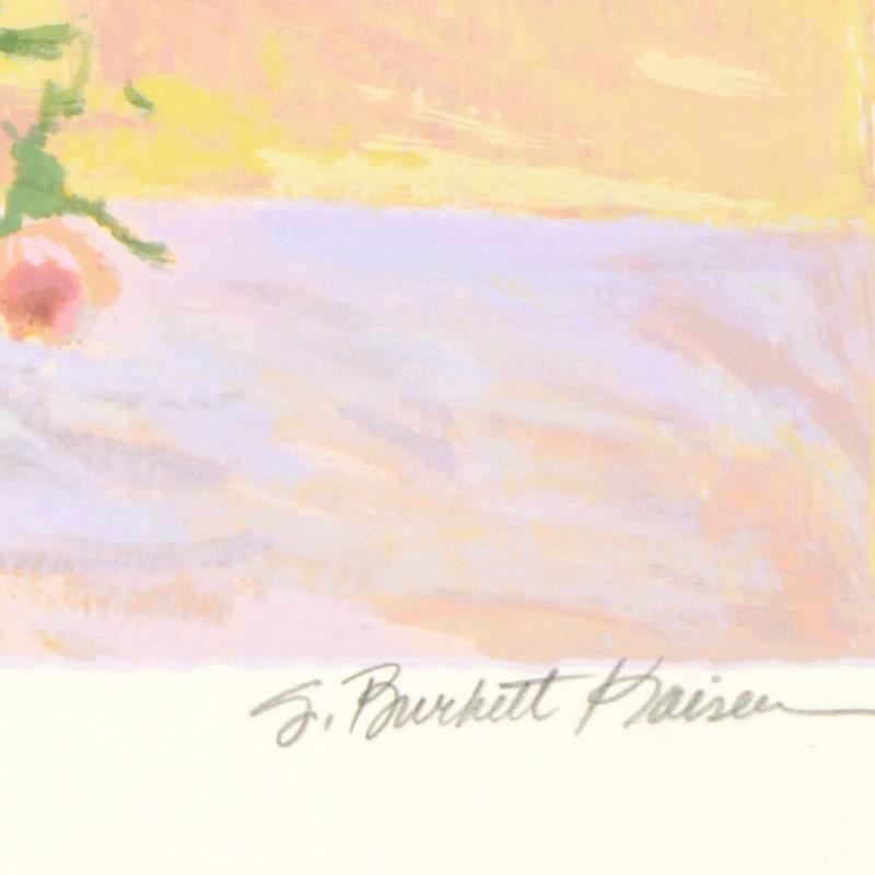 "Seaside Roses" is a limited edition giclee on paper by S. Burkett Kaiser numbered and hand signed by the artist. Includes Letter of Authenticity. Measures approx. 15" x 15" (border) 12" x 12" (image).