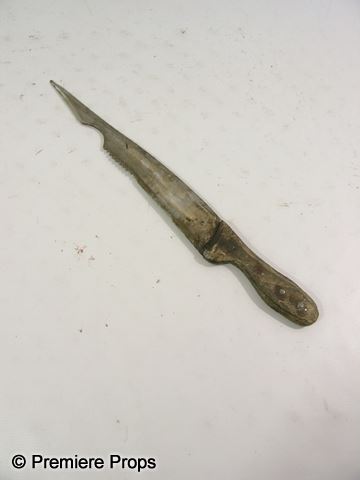 Straight from the set of the Fourteenth Century fantasy thriller, Season of the Witch, this is Monk's screen used, hero, steel metal pointed blade with teeth in the center and wood handle, Monk knife. (approx. 19" long) Black resin has been rubbed on the knife for aged effect. The blade has been dulled for production.