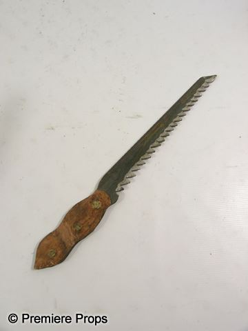 Direct from the set of Season of the Witch, this is Monk's screen used, hero, steel metal pointed saw blade with metal handle, Monk knife. (approx. 15" long) Black resin has been rubbed on the knife for aged effect. The blade has been dulled for production.