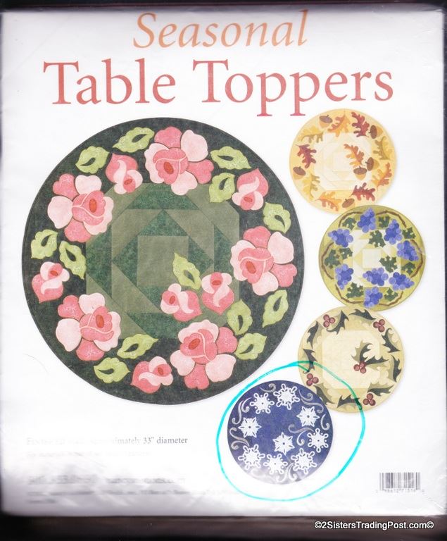 Serene Snowflakes' seasonal table topper kit #SSSTTKT by sewing with nancy for Nancy's Notions. Kit includes pattern, 6 fabrics, tissue lame, stabilizer, fusible web, backing and batting. Approximate finished size 33" diameter MSRP $32.