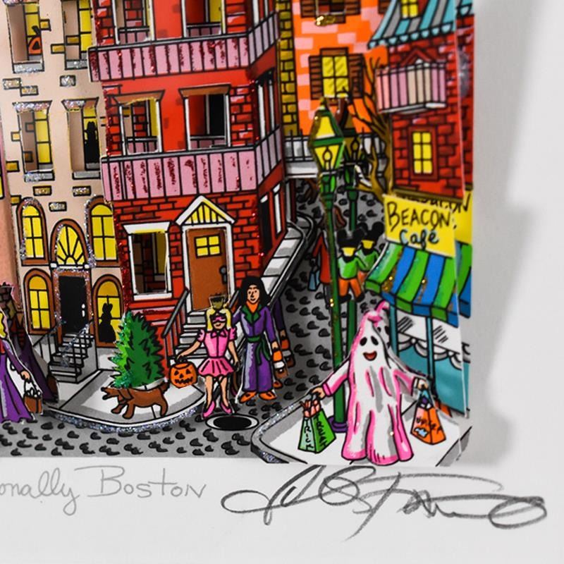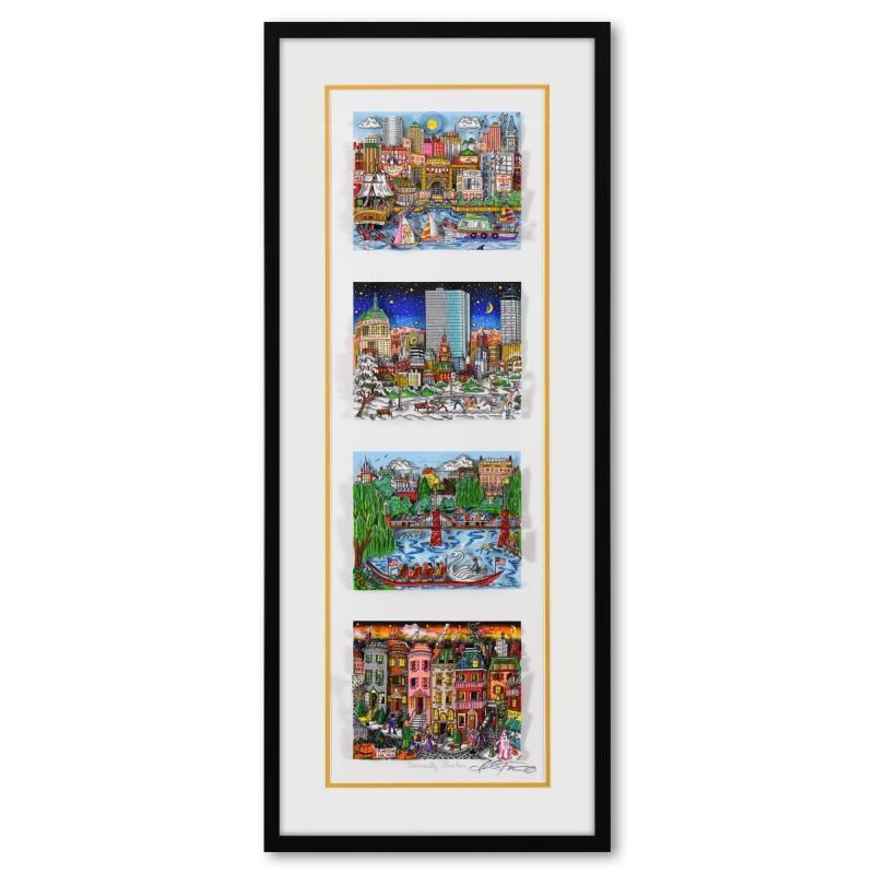 "Seasonally Boston (Yellow)" is a 3D limited edition silk screen construct on paper by Charles Fazzino, numbered and hand signed by the artist. This piece comes custom framed. Includes Certificate of Authenticity. Measures approximately 16.5" x 39" (framed), 10" x 33" (image).