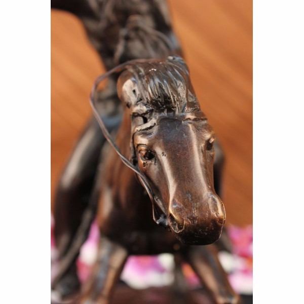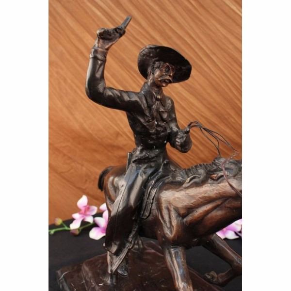 A seasoned cowboy is casually patrolling the area, when suddenly something catches his attention. He yanks on the reins and his loyal horse charges forward. They gallop through the open dry plains as he shoots his pistol in the Air. He is dressed in a Shirt, Chaps and Boots, giving him the look of a good ole fashioned sheriff. A long rifle is slung to his side. This two-toned brown patina sculpture was cast using the lost wax method and mounted on a black marble base. Bronze dimensions with marble base: Height 14 X Width 16 inches. Weight: 22 lbs.Please Note: This is a reproduced bronze sculpture from the original molded and signed. This featured bronze sculpture is a recast after the original, and has been done recently. This 100% bronze sculpture is an abstract piece certain to be a conversation piece.