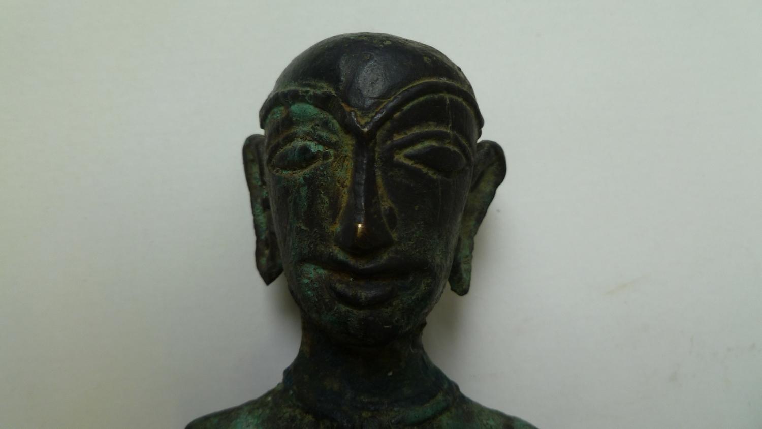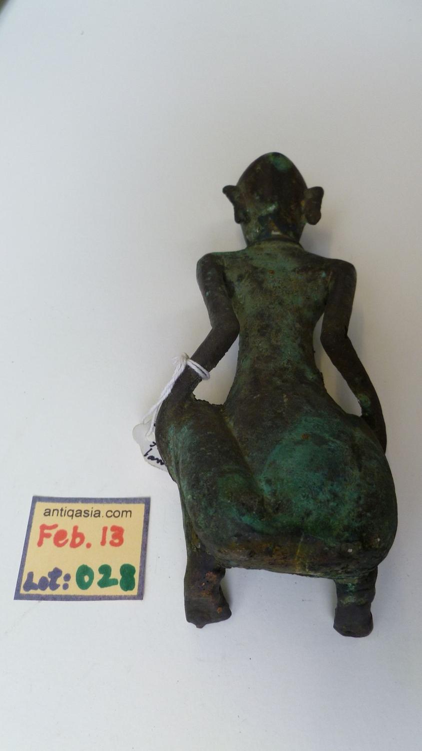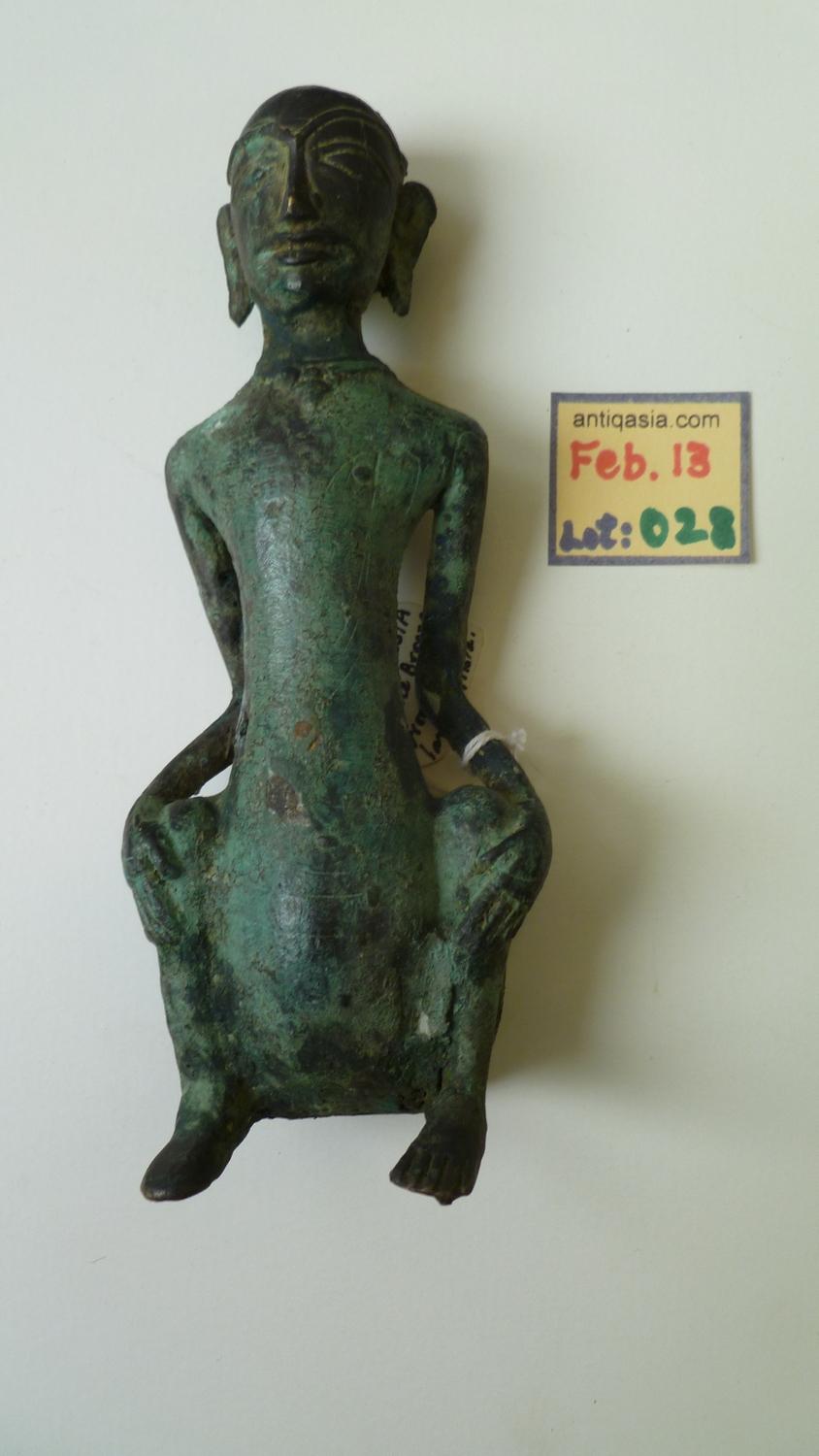 Indonesia, the sculpture has "oriental almond eyes" and elongated "spiritual" ears and good, hard patina. A few old & small holes are scattered around and possibly filled in at the base region, and he may represent an ancestral spirit who was hoped would come and reside within the sculpture. 6-1/2" tall, 700-1200AD, and very scarce.