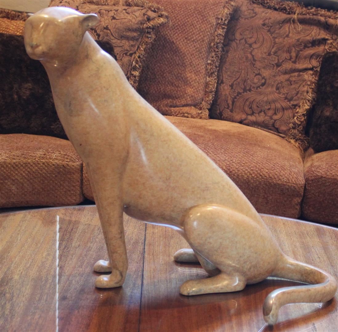 Sculptor Loet Vanderveen's love for animals is seen in this regal bronze work of a light tan-colored sitting cheetah. The sculpture measures 19 x 12 x 21.