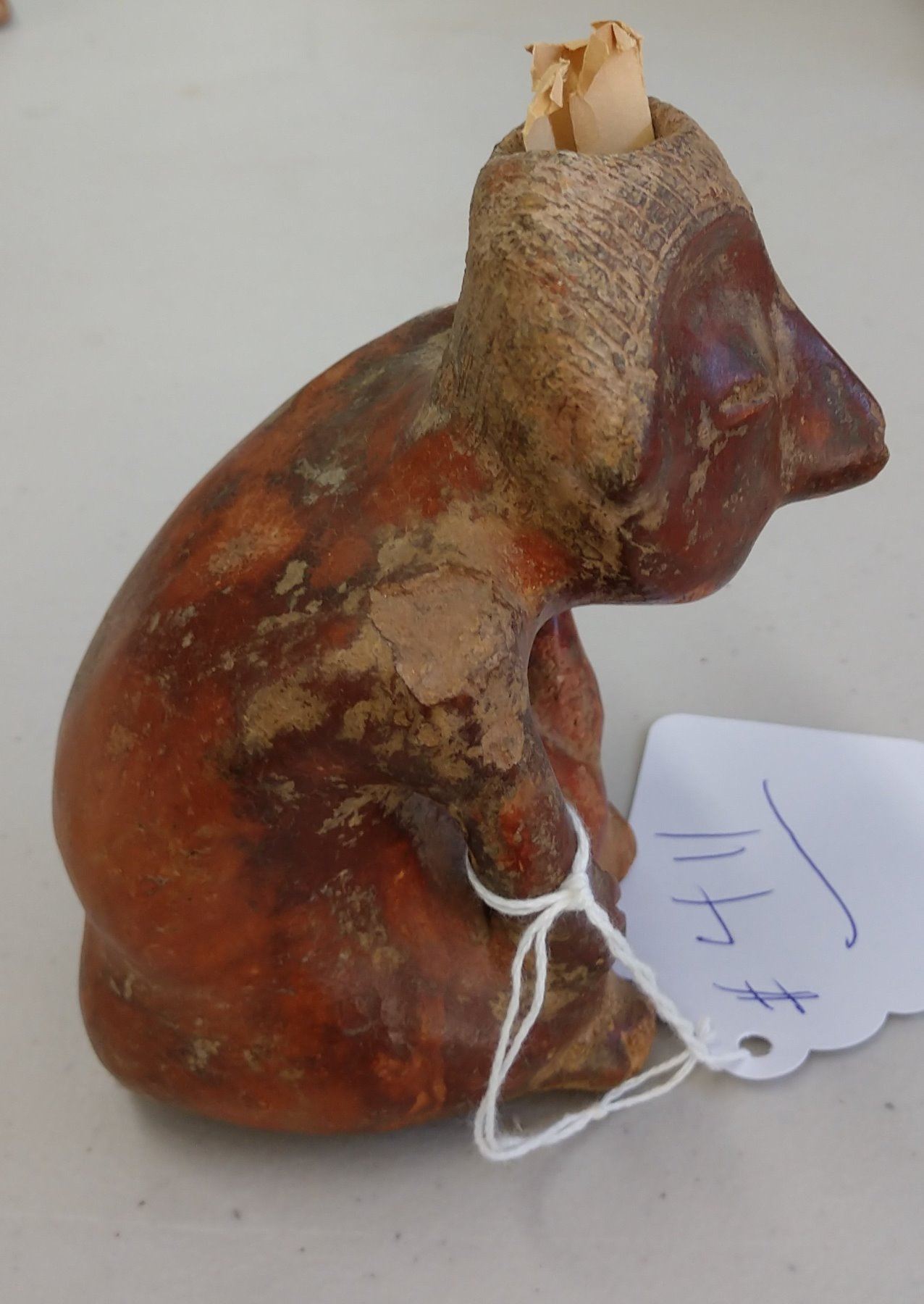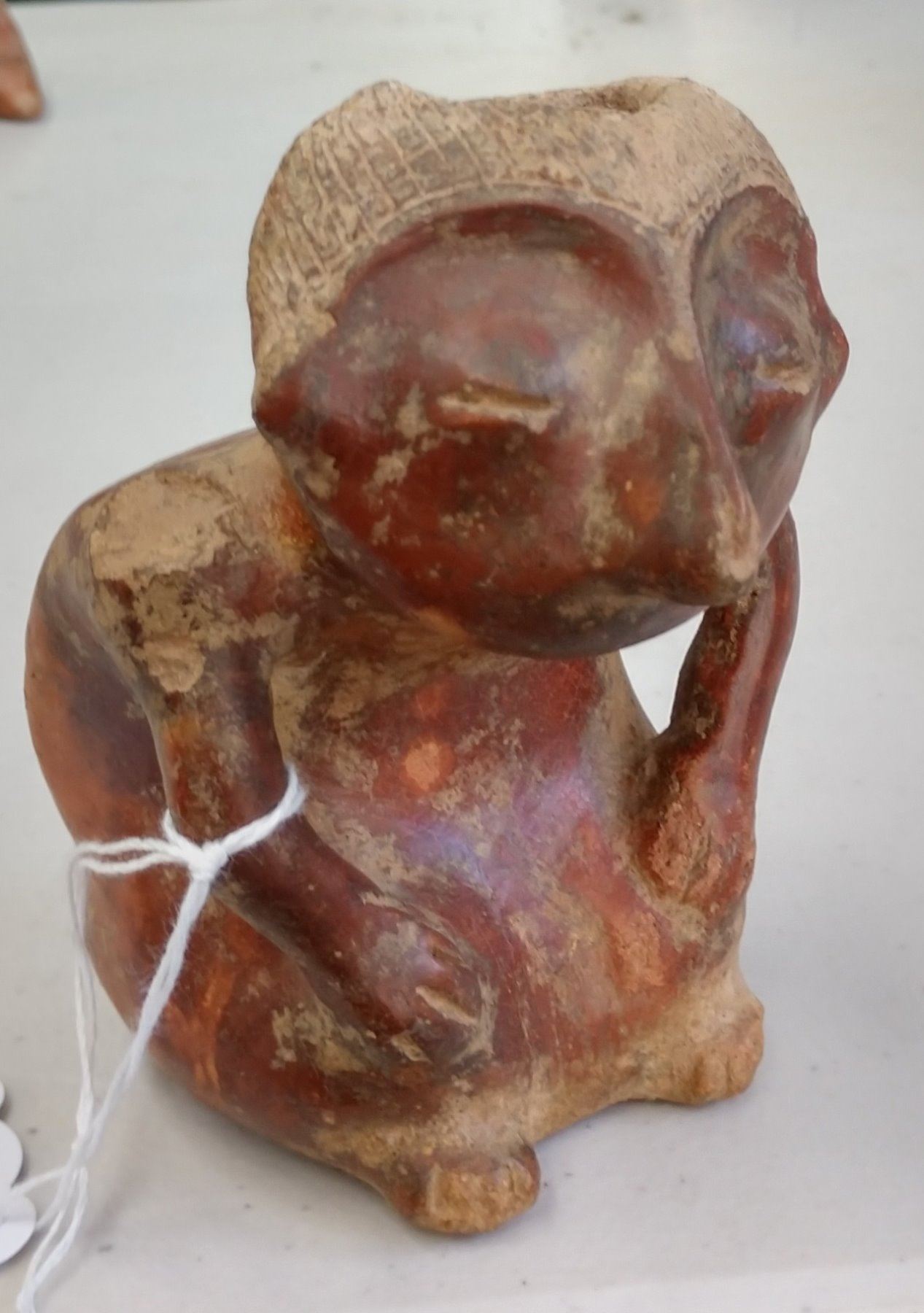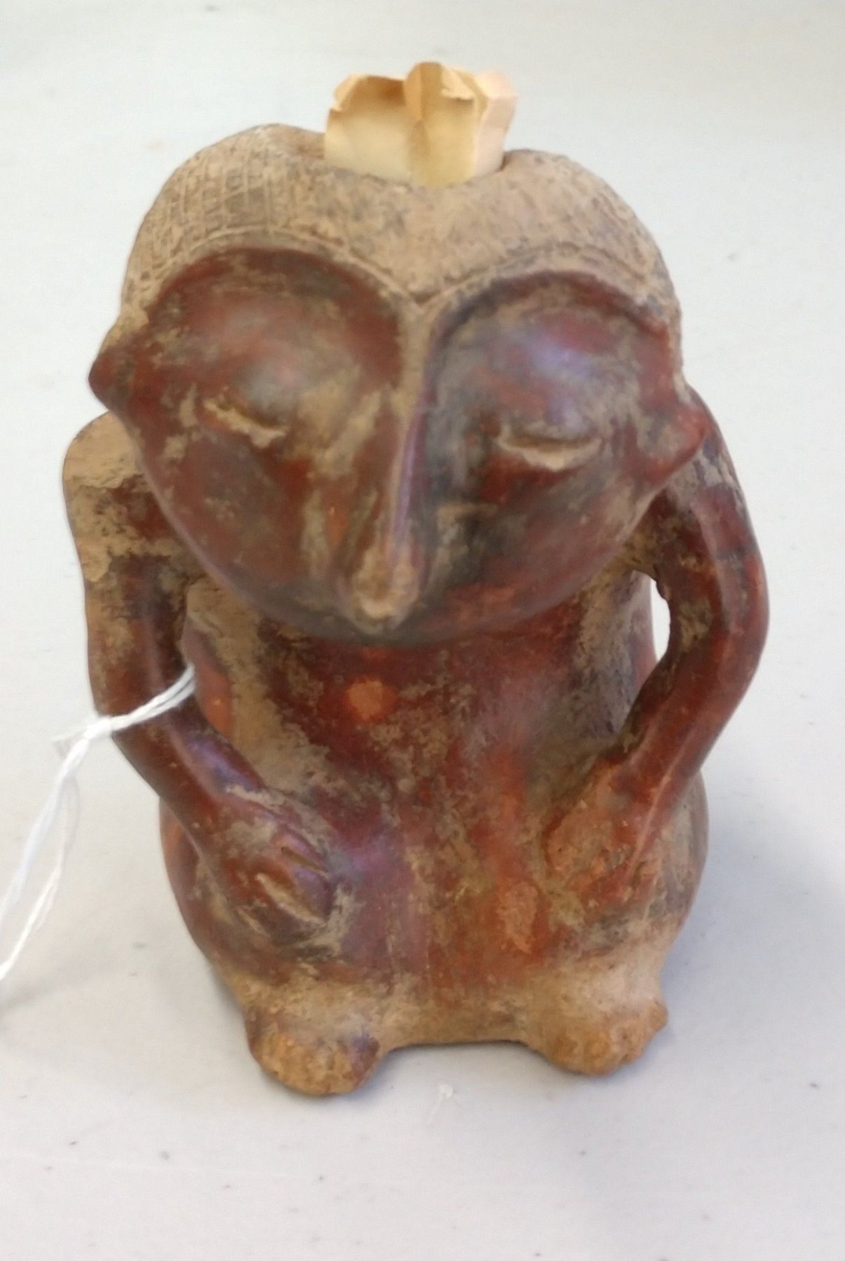 Seated Chinesco Figure, c. 1700 years old. Made of clay and paint, the item measures 5" x 3" x 3". Nayarit, Mexico. Type A. From an old, 1960s California collection. Condition: Minor nick on shoulder, see images. Shipping: $45.00 USA estimate only, w/insurance and signature.