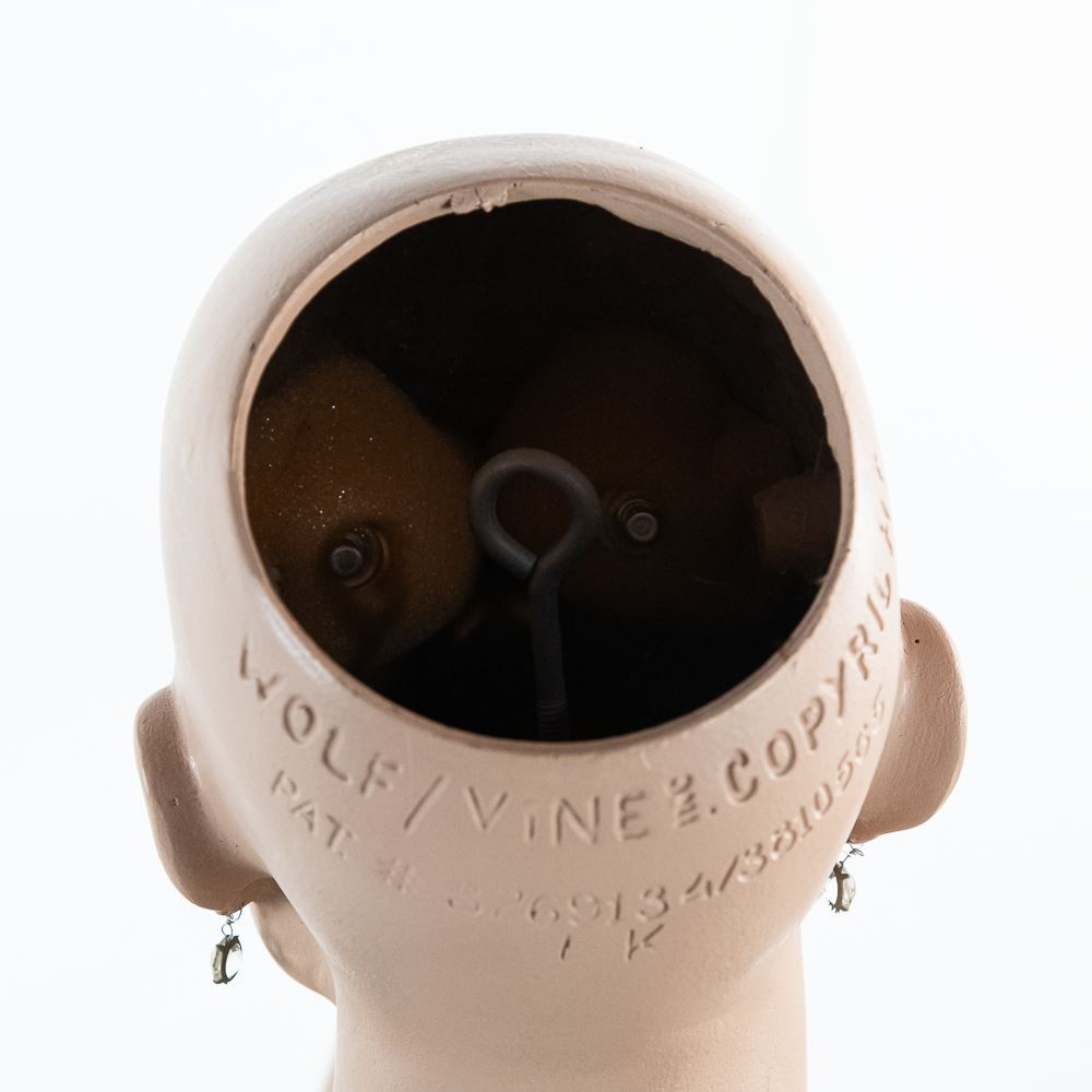 High quality torso features glass eyes, eyelashes, and pierced ears. No wig included. Removable arms hands, and legs. Currently posed seated and sitting on one leg. In VG condition.