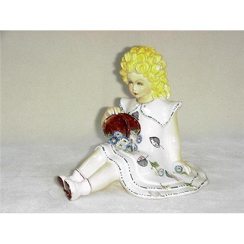 Soft paste porcelain figure of a girl sitting with a basket of flowers on her lap, hand painted. Her dress is spread out around her and the flowers are spilling out of the basket. Her hair is heavily curled. Marked on underside with the letter N with a crown over it.Two chipps one to hem of dress and one to sleeve, other minor surface inperfections.