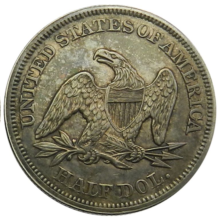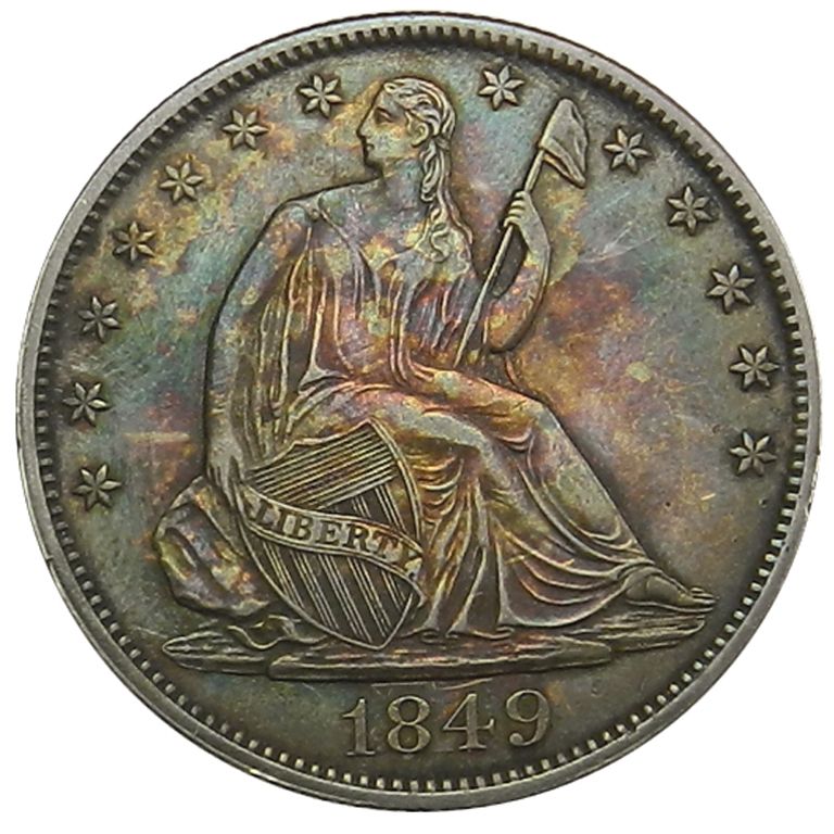 Seated Liberty Half Dollar, 1849. Choice EF-AU, vibrant colorful toning.